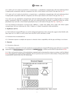 ABSTRACT This specification covers requirements and test methods for materials, dimensions, workmanship, elongation, impact resistance, pipe stiffness, perforations, and markings for steel reinforced corrugated polyethylene (PE) piping systems. The steel reinforced polyethylene pipes governed by this standard are intended for use in underground applications where soil provides support for their flexible walls. These pipes will be used to collect or convey storm-water runoff for storm sewers and drainage pipes, or both. The following tests shall be performed: pipe dimensions and tolerances; perforations; pipe stiffness; steel to the polyethylene bonding; and joint tightness. SIGNIFICANCE AND USE 4.1 Steel reinforced corrugated PE pipes are used for underground applications where soil provides support to their flexible walls. Their major use is to collect or convey storm water run-off for sewers and drains, or both. 4.2 Exclusions from recommended use: 4.2.1 Permanent exposure to sunlight and exposure to chemicals whose compatibility with the pipe and fittings is not known. SCOPE 1.1 This specification covers requirements and test methods for materials, dimensions, workmanship, elongation, impact resistance, pipe stiffness, perforations, and markings for steel reinforced corrugated polyethylene (PE) piping systems of nominal sizes 8 in. (200 mm), through 80 in. (2000 mm). The steel reinforced polyethylene pipes governed by this standard are intended for use in underground applications where soil provides support for their flexible walls. The steel reinforced polyethylene corrugated pipes governed by this standard are intended for use in non-pressure applications for sanitary sewers, storm sewers and drainage pipes. 1.2 The values stated in inch-pound units are to be regarded as standard. The values given in parentheses are mathematical conversions to SI units that are provided for information only and are not considered standard. 1.3 There is no similar or equivalent ISO standard. 1.4 This standard does not purport to address all of the safety concerns, if any, associated with its use. It is the responsibility of the user of this standard to establish appropriate safety, health, and environmental practices and determine the applicability of regulatory limitations prior to use. 1.5 This international standard was developed in accordance with internationally recognized principles on standardization established in the Decision on Principles for the Development of International Standards, Guides and Recommendations issued by the World Trade Organization Technical Barriers to Trade (TBT) Committee.