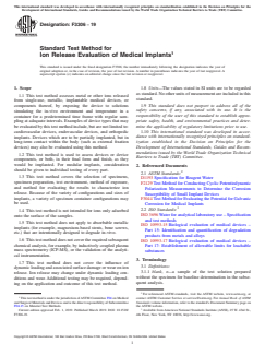 SIGNIFICANCE AND USE 5.1 Components of implanted medical devices can release ions, which may lead to adverse biological effects if released in sufficient quantities. Therefore, it may be necessary to characterize the ion release behavior over time to verify that a medical device or device components, or both, will not pose an unacceptable risk to patients. Some examples of when time-dependent ion release testing should be considered include: 5.1.1 New materials, 5.1.2 New applications (for example, different in-vivo environments or new designs) that may degrade corrosion resistance, 5.1.3 Manufacturing processes that may lead to increased ion release susceptibility, 5.1.4 Results of other corrosion testing (for example, Test Methods F2129 and F3044) indicate high susceptibility to corrosion. 5.2 Forming and finishing steps used to create an implantable device may have significant effects on the ion release behavior of the material from which the device is fabricated. Preconditioning can impact the ion release behavior of implants; therefore, prior to testing, devices should be subjected to preconditioning that is appropriate to their application. A justification shall be provided if preconditioning is omitted. Additional information on preconditioning is found in Appendix X1. Substitute test articles (tubes, plates, wires, device subcomponents, etc.) may be used for testing with adequate justification, if all processing steps, including sterilization and preconditioning, are comparable to the finished device. 5.3 To accommodate the wide variety of device shapes and sizes likely to be encountered, various sizes and shapes of containers manufactured from various materials can be used. The container material choice should be justified. 5.4 Note that the test conditions described in this test method may not completely simulate those encountered in vivo (cells, proteins, mechanical loading, and other specifics of the in-vivo environment); however, the results of this tes... SCOPE 1.1 This test method assesses metal or other ions released from single-use, metallic, implantable medical devices, or components thereof, by exposing the device to solutions simulating the in-vivo environment and temperature in a container for a predetermined time frame with regular sampling at adequate intervals. Examples of device types that may be evaluated by this test method include, but are not limited to: cardiovascular devices, endovascular devices, and orthopedic implants. Devices which are to be partially implanted, but in long-term contact within the body (such as external fixation devices) may also be evaluated using this method. 1.2 This test method is used to assess devices or device components, or both, in their final form and finish, as they would be implanted. For modular implants, consideration should be given to individual testing of every part. 1.3 This test method covers the selection of specimens, specimen preparation, test environment, method of exposure, and method for evaluating the results to characterize ion release. Because of the variety of configurations and sizes of implants, a variety of specimen container configurations may be used. 1.4 This test method is not intended for ions only adsorbed onto the surface of the samples. 1.5 This test method does not apply to absorbable metallic implants (for example, magnesium-based stents, bone screws, etc.) that are intentionally designed to degrade in-vivo. 1.6 This test method does not cover the required subsequent chemical analysis, for example, by inductively coupled plasma mass spectrometry (ICP-MS), or the validation of the analytical instrumentation. 1.7 This test method does not cover the influence of dynamic loading and associated surface damage or wear on ion release. Ion release may change under dynamic loading conditions and wear. Additional testing may be required, depending on the application and outcome of this test ...