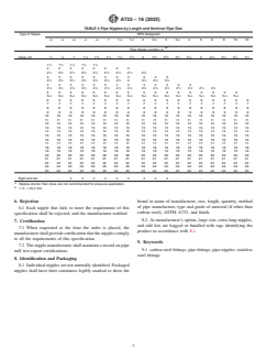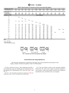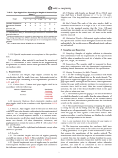 ABSTRACT This specification covers welded and seamless carbon steel and austenitic stainless steel pipe nipples. The mechanical requirements stated that, pipe nipples shall be made from new, hydrostatic tested or NDE-tested pipe, pipe and nipples shall be threaded on both ends with NPT taper pipe threads. The standard and special lengths and sizes of nipples are presented. Galvanized nipples ordered under this specification shall be made from pipe coated on the inside and outside by the hot dip process. Samples of nipples sufficient to determine their conformance with the requirements of this specification shall be taken at random for each lot of nipples of the same pipe size, length, and material, also, samples shall be inspected to determine their conformance with the dimensional requirements, including thread dimensions. SCOPE 1.1 This specification covers the requirements for welded and seamless carbon steel pipe nipples, black and zinc-coated (hot-dip galvanized), and welded and seamless austenitic stainless steel pipe nipples in standard steel pipe sizes from 1/8 to 12 in. inclusive, in standard or special lengths. 1.1.1 Welded Carbon Steel—Pipe nipples ordered under these requirements are intended for general uses, as described by Specification A53/A53M or for low-temperature service as described by Specification A333/A333M. 1.1.2 Seamless Carbon Steel—Pipe nipples ordered under these requirements are intended for general and special uses, as described by the applicable Specifications A53/A53M and A106/A106M or for low temperature service as described by Specification A333/A333M (see 4.1.1). 1.1.3 Austenitic Stainless Steel—Pipe nipples ordered under these requirements are intended for high-temperature and general corrosion service, as described by Specification A312/A312M (see 4.1.2). 1.1.4 The text for this specification contains notes or footnotes, or both, that provide explanatory material. Such notes and footnotes, excluding those in tables, do not contain any mandatory language. 1.2 The values stated in inch-pound units are to be regarded as standard. The values given in parentheses are mathematical conversions to SI units that are provided for information only and are not considered standard. 1.3 This international standard was developed in accordance with internationally recognized principles on standardization established in the Decision on Principles for the Development of International Standards, Guides and Recommendations issued by the World Trade Organization Technical Barriers to Trade (TBT) Committee.