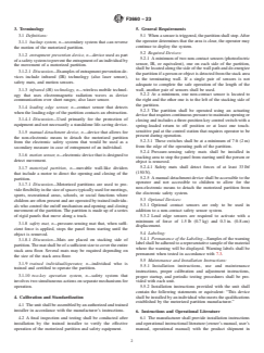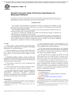 SCOPE 1.1 This consumer safety performance specification establishes performance requirements, test methods, and labeling requirements for motorized partitions. 1.2 Motorized partitions are used to provide flexibility in the size of spaces typically used for meetings, sports, recreational areas, schools, or social functions where children are often present. 1.3 Motorized partitions include a motor to direct the opening and closing of the partition and are operated by trained individuals who control the on/off mechanism and opening and closing movement of the partition. 1.4 The partition is made up of a series of rigid panels that move along a track. 1.5 This specification does not include motorized curtains, elevator or garage doors, or non-motorized partitions. 1.6 This specification shall be taken into consideration by owners/operators, architects, planners, engineers, equipment manufacturers, construction companies, construction contractors, and appropriate inspectors who may be involved in the design and construction of new facilities. 1.7 This specification applies to the installation of new motorized partitions but may be useful for renovation projects such as updating older motorized partitions. 1.8 The values stated in inch-pound units are to be regarded as the standard. The values given in parentheses are mathematical conversions to SI units that are provided for information only and are not considered standard. 1.9 This standard does not purport to address all of the safety concerns, if any, associated with its use. It is the responsibility of the user of this standard to establish appropriate safety, health, and environmental practices and determine the applicability of regulatory limitations prior to use. 1.10 This international standard was developed in accordance with internationally recognized principles on standardization established in the Decision on Principles for the Development of International Standards, Guides and Recommendations issued by the World Trade Organization Technical Barriers to Trade (TBT) Committee.
