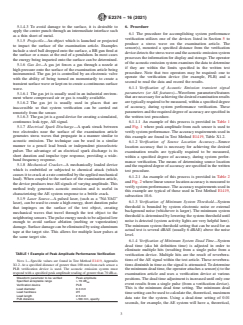 SIGNIFICANCE AND USE 4.1 Acoustic Emission data acquisition can be affected by numerous factors associated with the electronic instrumentation, cables, sensors, sensor holders, couplant, the examination article on which the sensor is mounted, background noise, and the user's settings of the acquisition parameters (for example, threshold). 4.2 This guide is not intended to replace annual (or semi-annual) instrumentation calibration (see Practice E750) or sensor recertification (see Practice E1781). 4.3 This guide is not intended to replace routine electronic evaluation of AE instrumentation or routine reproducibility verification of AE sensors (see Guide E976). 4.4 This guide is not intended to verify the maximum processing capacity or speed of an AE system. 4.5 This guide does not purport to address all of the safety concerns, if any associated with its use. It is the responsibility of the user of this guide to establish appropriate safety and health practices and determine the applicability of regulatory limitations prior to use. SCOPE 1.1 System performance verification methods launch stress waves into the examination article on which the sensor is mounted. The resulting stress wave travels in the examination article and is detected by the sensor(s) in a manner similar to acoustic emission. 1.2 This guide describes methods which can be used to verify the response of an Acoustic Emission system including sensors, couplant, sensor mounting devices, cables and system electronic components. 1.3 Acoustic emission system performance characteristics, which may be evaluated using this document, include some waveform parameters, and source location accuracy. 1.4 Performance verification is usually conducted prior to beginning the examination. 1.5 Performance verification can be conducted during the examination if there is any suspicion that the system performance may have changed. 1.6 Performance verification may be conducted after the examination has been completed. 1.7 The values stated in SI units are to be regarded as standard. No other units of measurement are included in this standard. 1.8 This standard does not purport to address all of the safety concerns, if any, associated with its use. It is the responsibility of the user of this standard to establish appropriate safety, health, and environmental practices and determine the applicability of regulatory limitations prior to use. 1.9 This international standard was developed in accordance with internationally recognized principles on standardization established in the Decision on Principles for the Development of International Standards, Guides and Recommendations issued by the World Trade Organization Technical Barriers to Trade (TBT) Committee.