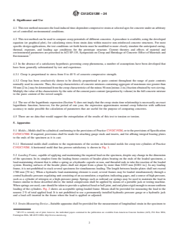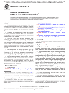 SIGNIFICANCE AND USE 4.1 This test method measures the load-induced time-dependent compressive strain at selected ages for concrete under an arbitrary set of controlled environmental conditions. 4.2 This test method can be used to compare creep potentials of different concretes. A procedure is available, using the developed equation (or graphical plot), for calculating stress from strain data within massive non-reinforced concrete structures. For most specific design applications, the test conditions set forth herein must be modified to more closely simulate the anticipated curing, thermal, exposure, and loading age conditions for the prototype structure. Current theories and effects of material and environmental parameters are presented in ACI SP-135, Symposium on Creep and Shrinkage of Concrete: Effect of Materials and Environment.3 4.3 In the absence of a satisfactory hypothesis governing creep phenomena, a number of assumptions have been developed that have been generally substantiated by test and experience. 4.3.1 Creep is proportional to stress from 0 to 40 % of concrete compressive strength. 4.3.2 Creep has been conclusively shown to be directly proportional to paste content throughout the range of paste contents normally used in concrete. Thus, the creep characteristics of concrete mixtures containing aggregate of maximum size greater than 50 mm [2 in.] may be determined from the creep characteristics of the minus 50-mm [minus 2-in.] fraction obtained by wet-sieving. Multiply the value of the characteristic by the ratio of the cement paste content (proportion by volume) in the full concrete mixture to the paste content of the sieved sample. 4.4 The use of the logarithmic expression (Section 9) does not imply that the creep strain-time relationship is necessarily an exact logarithmic function; however, for the period of one year, the expression approximates normal creep behavior with sufficient accuracy to make possible the calculation of parameters that are useful... SCOPE 1.1 This test method covers the determination of the creep of molded concrete cylinders subjected to sustained longitudinal compressive load. This test method is limited to concrete in which the maximum aggregate size does not exceed 50 mm [2 in.]. 1.2 The text of this standard refers to notes and footnotes that provide explanatory material. These notes and footnotes (excluding those in tables and figures) shall not be considered as requirements of the standard. 1.3 Units—The values stated in either SI units or inch-pound units are to be regarded separately as standard. The values stated in each system are not necessarily exact equivalents; therefore, to ensure conformance with the standard, each system shall be used independently of the other, and values from the two systems shall not be combined. Combining values from the two systems may result in non-conformance with the standard. 1.4 This standard does not purport to address all of the safety concerns, if any, associated with its use. It is the responsibility of the user of this standard to establish appropriate safety, health, and environmental practices and determine the applicability of regulatory limitations prior to use. 1.5 This international standard was developed in accordance with internationally recognized principles on standardization established in the Decision on Principles for the Development of International Standards, Guides and Recommendations issued by the World Trade Organization Technical Barriers to Trade (TBT) Committee.