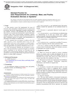 ASTM F2341-05(2021) is a standard published by ASTM International. Its full title is "Standard Practice for User Requirements for Livestock, Meat, and Poultry Evaluation Devices or Systems". This standard covers: SIGNIFICANCE AND USE 4.1 There are several live animal or carcass evaluation devices or systems used or under development for use in determination of economic value of live animals, carcasses, or individual cuts of meat. The correct use of these devices or systems may affect the reliability of the data. 4.2 This practice provides user requirements for installation, operator training, operation, verification, inspection, maintenance, and retention of original data. SCOPE 1.1 This practice covers the requirements for users of livestock, meat, and poultry evaluation devices or systems used to measure and record composition or quality constituents of live animals, carcasses, and individual cuts of meat, when those devices or systems provide data that is used to determine economic value. Areas covered include: installation, operator training, operation, verification, inspection and maintenance of these evaluation devices or systems, and documentation of procedures for retention of original data. 1.2 This standard does not purport to address all of the safety concerns, if any, associated with its use. It is the responsibility of the user of this standard to establish appropriate safety, health, and environmental practices and determine the applicability of regulatory limitations prior to use. 1.3 This international standard was developed in accordance with internationally recognized principles on standardization established in the Decision on Principles for the Development of International Standards, Guides and Recommendations issued by the World Trade Organization Technical Barriers to Trade (TBT) Committee.