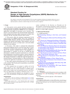 ASTM F1759-97(2018) is the Standard Practice for the Design of High-Density Polyethylene (HDPE) Manholes for Subsurface Applications, issued by ASTM International. This standard provides guidelines for designing manholes and related components made from HDPE, specifically for use in subsurface utility access, such as pipelines and landfill perimeters. It is intended to ensure safe, reliable, and durable HDPE manholes that meet essential requirements for subsurface installation while accounting for soil, backfill, groundwater, and loading conditions. The standard sets out minimum design procedures and structural considerations necessary to maximize long-term performance under typical site conditions.