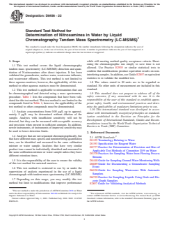 SIGNIFICANCE AND USE 5.1 Nitrosamines are a class of nitrogen-containing compounds with a known occurrence in wastewater. They may also be created in deionization and are a potential contaminant in water for reuse. The World Health Organization has issued a guideline for NDMA in drinking water at 0.1 µg/L. NDMA may occur in chlorinated effluents and other wastewaters. Other methods for nitrosamines employ solid phase extraction, which may not be applicable to wastewaters that contain particulate matter or a high organic load. This method analyses nitrosamines directly using LC-MS/MS. SCOPE 1.1 This test method covers the liquid chromatography tandem mass spectrometry (LC-MS/MS) detection and quantitation of N-nitrosamines after direct injection. It has been validated for groundwater, surface water, wastewater influents, and wastewater effluents. This test method is not limited to these aqueous matrices; however, the applicability of this test method to other aqueous matrices must be demonstrated. 1.2 This test method is applicable to nitrosamines that can be chromatographed and detected using a mass spectrometry procedure. Table 1 lists the compounds that have been validated for this test method. This test method is not limited to the compounds listed in Table 1; however, the applicability of the test method to other compounds must be demonstrated. 1.3 Analyte concentrations from 0.05 µg/L up to approximately 5 µg/L may be determined without dilution of the sample. Analytes with insufficient sensitivity will not be detected, but they can be measured with acceptable accuracy and precision when present in sufficient amounts. In addition, newer instruments, or instruments of improved sensitivity may be used to lower detection limits. 1.4 Analytes that are not separated chromatographically, but that have different mass spectra and noninterfering quantitation ions, can be identified and measured in the same calibration mixture or water sample. Analytes that have very similar product ions cannot be individually identified and measured in the same calibration mixture or water sample unless they have different retention times. 1.5 It is the responsibility of the user to ensure the validity of this test method for untested matrices. 1.6 This test method is restricted to use by or under the supervision of analysts experienced in the use of a liquid chromatograph with tandem mass spectrometry (LC-MS/MS). 1.7 Depending on data usage, you may modify this test method but limit to modifications that improve performance while still meeting method quality acceptance criteria. Shortening the chromatographic run simply to save time is not allowed. Use Practice E2935 or similar statistical tests to confirm that modifications produce equivalent results on non-interfering samples. In addition, use Guide E2857 or equivalent statistics to re-validate the modified test. 1.8 The values stated in SI units are to be regarded as standard. No other units of measurement are included in this standard. 1.9 This standard does not purport to address all of the safety concerns, if any, associated with its use. It is the responsibility of the user of this standard to establish appropriate safety, health, and environmental practices and determine the applicability of regulatory limitations prior to use. 1.10 This international standard was developed in accordance with internationally recognized principles on standardization established in the Decision on Principles for the Development of International Standards, Guides and Recommendations issued by the World Trade Organization Technical Barriers to Trade (TBT) Committee.