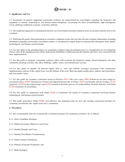 SIGNIFICANCE AND USE 5.1 Investments in projects supporting community resilience are characterized by uncertainties regarding the frequency and magnitude of natural, technological, and human-caused disruptions. Accounting for these low-probability, high-consequence events challenge traditional economic evaluation methods. 5.2 The traditional approach to evaluating the benefit-cost of investment decisions routinely focus on measures directly tied to loss avoidance. 5.3 Following this guide when performing an economic evaluation assures the user that relevant economic information, including information regarding uncertainties and indirect inputs, is considered for capital project facing possible disruptions from natural, technological, and human-caused hazards. 5.4 Use this guide in the planning phases of community resilience plan development process. Consideration of risk mitigation choices early in the planning process allows both greater flexibility in addressing specific hazards and lower costs associated with their implementation. 5.5 Use this guide to integrate community resilience plans with economic development, zoning, hazard mitigation, and other community planning activities that affect buildings, public works, and infrastructure systems. 5.6 Use this guide to identify all relevant inputs—that is, costs and benefits (savings)—associated with construction, implementation, and use of the capital asset, over the lifetime of the asset. Relevant inputs include direct, indirect and externalities, and non-market values. 5.7 Use this guide for economic evaluations based on Practices E917 (life-cycle costs), E964 (benefit-to-cost and savings-to-investment ratios), E1057 (internal rate of return and adjusted internal rate of return), E1074 (net benefits and net savings), E1121 (payback), E1699 (value engineering), and E1765 (analytical hierarchy process for multi-attribute decision analysis), and Guide E1369 (treatment of uncertainty). 5.8 Use this guide in conjuncti... SCOPE 1.1 This guide describes a generic economic methodology for evaluating investment decisions aimed to improve the ability of communities to adapt to, withstand, and quickly recover from, disruptive events. The methodology describes a framework for developing cost-effective community resilience strategies for new and existing constructed facilities—buildings, industrial facilities, and other critical infrastructure. This guide provides owners and managers of constructed facilities, architects, engineers, constructors, other providers of professional services for constructed facilities, and researchers and analysts with an approach for planning and comparing resilience strategies. 1.2 This guide frames the economic decision process by identifying and comparing the relevant present and future streams of costs and benefits to a community—the latter realized through cost savings and damage loss avoidance—associated with new capital investment into resilience to those generated by the status-quo. 1.3 This guide provides a means to increase the capacity of communities to objectively and effectively compare and contrast capital investment projects through consideration of benefits and costs while maintaining an awareness of system resilience. Topics related to non-market values and uncertainty are also explored. 1.4 This standard does not purport to address all of the safety concerns, if any, associated with its use. It is the responsibility of the user of this standard to establish appropriate safety, health, and environmental practices and determine the applicability of regulatory limitations prior to use. 1.5 This international standard was developed in accordance with internationally recognized principles on standardization established in the Decision on Principles for the Development of International Standards, Guides and Recommendations issued by the World Trade Organization Technical Barriers to Trade (TBT) Com...