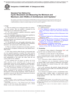 ASTM E1399/E1399M-97(2022): Standard Test Method for Cyclic Movement and Measuring the Minimum and Maximum Joint Widths of Architectural Joint Systems provides a standardized approach for testing the cyclic movement of architectural joint systems. Issued by ASTM International, this method establishes guidelines for evaluating how architectural joint systems perform when subject to cyclic (repetitive opening and closing) movements between their minimum and maximum joint widths. The test aims to verify movement capability and ensure that products meet performance expectations under controlled laboratory conditions.
