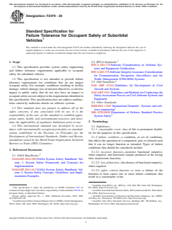 SCOPE 1.1 This specification provides system safety engineering and failure tolerance requirements applicable to occupant safety for suborbital vehicles. 1.2 This specification is not intended to provide failure tolerance requirements for conditions that do not impact occupant safety. For example, conditions resulting in facility damage, vehicle damage, loss of mission objectives, or adverse impact to public safety that do not also have an impact to occupant safety are not subject to the requirements identified in this specification. This specification does not address malfunctions caused by malicious attacks on software systems. 1.3 This standard does not purport to address all of the safety concerns, if any, associated with its use. It is the responsibility of the user of this standard to establish appropriate safety, health, and environmental practices and determine the applicability of regulatory limitations prior to use. 1.4 This international standard was developed in accordance with internationally recognized principles on standardization established in the Decision on Principles for the Development of International Standards, Guides and Recommendations issued by the World Trade Organization Technical Barriers to Trade (TBT) Committee.