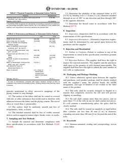 ABSTRACT This specification covers woven cotton fabrics saturated with either asphalt or coal-tar intended for use with asphalt based plying cement (such as mopping asphalts or appropriate solvent bearing asphaltic compounds), coal-tar based plying cement (such as coal-tar pitch or other appropriate solvent bearing coal-tar compounds), or appropriate solvent bearing bituminous materials in the construction of roofing and waterproofing systems. The dry cotton fabric shall be thoroughly and uniformly saturated with bitumen by passing the fabric through the saturant or by spraying with saturant, calendering in the presence of heat, and then cooling before winding on a core. Products shall be sampled, tested, and adhere accordingly to specified physical (breaking load in both the warp and fill directions, and pliability), and dimensional (mass, width, thread count, moisture, and ash content) property requirements. The finished product shall not crack nor be so sticky as to cause tearing or other damage upon being unrolled at a given temperature. SCOPE 1.1 This specification covers woven cotton fabrics saturated with either asphalt or coal-tar pitch intended to be used with asphalts conforming to Specifications D312/D312M or D449/D449M, coal-tar pitches conforming to Specification D450/D450M, or appropriate solvent bearing bituminous materials in the construction of roofing and waterproofing systems. 1.1.1 Asphalt-saturated cotton fabric shall be used with asphalt base plying cement; typical ones are mopping asphalts conforming to Specifications D312/D312M or D449/D449M or appropriate solvent bearing asphaltic compounds. 1.1.2 Coal-tar-saturated cotton fabric shall be used with coal-tar based plying cements; a typical one is coal-tar pitch conforming to Specification D450/D450M or appropriate solvent bearing coal-tar compounds. 1.2 The values stated in either SI units or inch-pound units are to be regarded separately as standard. The values stated in each system may not be exact equivalents; therefore, each system shall be used independently of the other. Combining values from the two systems may result in non-conformance with the standard. 1.3 This international standard was developed in accordance with internationally recognized principles on standardization established in the Decision on Principles for the Development of International Standards, Guides and Recommendations issued by the World Trade Organization Technical Barriers to Trade (TBT) Committee.
