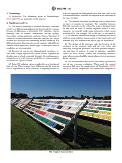 SIGNIFICANCE AND USE 4.1 The relative durability of materials in natural exposures can be very different depending on the location of the exposure because of differences in ultraviolet (UV) radiation, relative humidity, time of wetness, temperature, wet-dry cycling, freeze-thaw cycling, pollutants, and other factors. Therefore, it cannot be assumed that results from one exposure in a single location will be useful for determining relative durability in a different location. Exposures in several locations with different climates which represent a broad range of anticipated service conditions are recommended. 4.2 Because of year-to-year climatological variations, results from a single exposure test cannot be used to predict the absolute rate at which a material degrades. Several exposures, repeated over several years are needed to get a representative test result for a given location. 4.3 Solar UV radiation varies considerably as a function of time of year. This can cause large differences in the apparent rate of degradation in many materials. Comparing results for materials exposed for short periods (less than one year) is not recommended unless materials are exposed at the same time in the same location. 4.4 The duration of natural weathering tests is often based on time (24 months for example). The variability between different exposures can be reduced by using a duration based on total solar or solar UV radiant exposure. Solar UV measurements are typically made using instruments which record broadband UV (for example, 295 to 385 nm), as described in 7.2.4. An inherent limitation in timing a weathering test based solely on solar-radiation measurements is that temperature and moisture may also influence the rate or type of degradation. 4.5 The design of the exposure rack, the location of the specimen on the exposure rack, and the type, color, and emissivity of adjacent specimens can affect specimen temperature and time of wetness. In order to minimize variability caused by t... SCOPE 1.1 This practice covers procedures to be followed for direct exposure of materials to the environment. Typically, this testing is performed on exposure racks tilted at a commonly-used tilt angle from the horizontal (such as 5 or 45 degrees) and facing the equator. Other exposure orientations can be used. 1.2 This practice is not intended for the corrosion testing of bare metals, or for testing behind glass. 1.2.1 For corrosion testing, refer to Practice G50 1.2.2 For exposures behind glass, refer to Practice G24 1.3 Units—The values stated in either SI units or inch-pound units are to be regarded separately as standard. The values stated in each system are not necessarily exact equivalents; therefore, to ensure conformance with the standard, each system shall be used independently of the other, and values from the two systems shall not be combined. 1.4 This practice is technically equivalent to the parts of ISO 877-1 and -2 that describe direct exposures of specimens to the environment. 1.5 This standard does not purport to address all of the safety concerns, if any, associated with its use. It is the responsibility of the user of this standard to establish appropriate safety, health, and environmental practices and determine the applicability of regulatory limitations prior to use. 1.6 This international standard was developed in accordance with internationally recognized principles on standardization established in the Decision on Principles for the Development of International Standards, Guides and Recommendations issued by the World Trade Organization Technical Barriers to Trade (TBT) Committee.