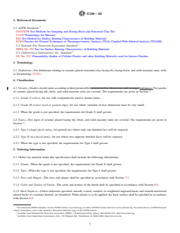 ASTM C126-22 is a technical specification published by ASTM International. Its full title is "Standard Specification for Ceramic Glazed Structural Clay Facing Tile, Facing Brick, and Solid Masonry Units". This standard covers: ABSTRACT This specification covers structural clay load-bearing facing tile and facing brick and other “solid masonry units” made from clay, shale, fire-clay, or mixtures thereof, with or without the addition of grog or other mixtures, having a finish consisting of a ceramic glaze fused to the body at above a certain temperature making them inseparable, excluding natural salt-glazed ware. The following grades and types are covered: Grade S which is for use with comparatively narrow mortar joints, Grade SS which is for use where variation of face dimension must be very small, Type I or single-faced unit which is for general use where only one finished face will be exposed, and Type II or two-faced unit which is for general use where two opposite finished faces will be exposed. The brick and tile are manufactured from clay, shale, or similar naturally occurring substances and subjected to a heat treatment at elevated temperatures (firing). The heat treatment must develop sufficient fired bond between the particulate constituents to provide the strength requirements specified. The masonry units are classified as solid masonry unit and hollow masonry unit. The former is a unit whose net cross-sectional area in every plane parallel to the bearing surface is 75 % or more of its gross cross-sectional area measured in the same plane and the latter is a unit whose net cross-sectional area in any plane parallel to the bearing surface is less than 75 % of its gross cross-sectional area measured in the same plane. Different tests shall be performed in order to determine the following properties: compressive strength, imperviousness, opacity, resistance to fading, resistance to autoclave crazing, flame spread, fuel contribution, smoke density, toxic fumes, hardness, and abrasion resistance. SCOPE 1.1 This specification covers structural clay load-bearing facing tile and facing brick and other “solid masonry units” made from clay, shale, fire-clay, or mixtures thereof, with or without the addition of grog or other mixtures, having a finish consisting of a ceramic glaze fused to the body at above 1500°F (655°C) making them inseparable, excluding natural salt-glazed ware. 1.2 The property requirements of this specification apply at the time of purchase. The use of results from testing of brick and tile extracted from masonry structures for determining conformance or nonconformance to the property requirements (Section 6) of this standard is beyond the scope of this specification. 1.3 Brick and tile covered by this specification are manufactured from clay, shale, or similar naturally occurring substances and subjected to a heat treatment at elevated temperatures (firing). The heat treatment must develop sufficient fired bond between the particulate constituents to provide the strength requirements of this specification. (See firing and fired bond in Terminology C1232.) 1.4 Two grades and two types of ceramic glazed units are covered. 1.5 The text of this standard references notes and footnotes which provide explanatory material. These notes and footnotes (excluding those in tables and figures) shall not be considered as requirements of the standard. 1.6 The values stated in inch-pound units are to be regarded as standard. The values given in parentheses are mathematical conversions to SI units that are provided for information only and are not considered standard. 1.7 The following precautionary caveat pertains only to the test portion of this specification. This standard does not purport to address all of the safety concerns, if any, associated with its use. It is the responsibility of the user of this standard to establish appropriate safety, health, and environmental practices and determine the applicability of regulatory limitations prior to use. 1.8 This international standard was developed in accordance with internationally recognized principles on standardization established in the Decision on Princip...