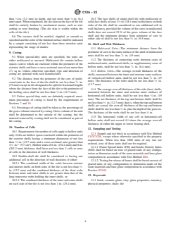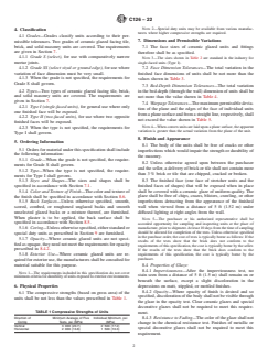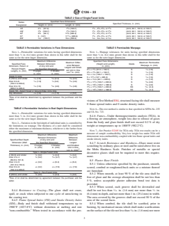ABSTRACT This specification covers structural clay load-bearing facing tile and facing brick and other “solid masonry units” made from clay, shale, fire-clay, or mixtures thereof, with or without the addition of grog or other mixtures, having a finish consisting of a ceramic glaze fused to the body at above a certain temperature making them inseparable, excluding natural salt-glazed ware. The following grades and types are covered: Grade S which is for use with comparatively narrow mortar joints, Grade SS which is for use where variation of face dimension must be very small, Type I or single-faced unit which is for general use where only one finished face will be exposed, and Type II or two-faced unit which is for general use where two opposite finished faces will be exposed. The brick and tile are manufactured from clay, shale, or similar naturally occurring substances and subjected to a heat treatment at elevated temperatures (firing). The heat treatment must develop sufficient fired bond between the particulate constituents to provide the strength requirements specified. The masonry units are classified as solid masonry unit and hollow masonry unit. The former is a unit whose net cross-sectional area in every plane parallel to the bearing surface is 75 % or more of its gross cross-sectional area measured in the same plane and the latter is a unit whose net cross-sectional area in any plane parallel to the bearing surface is less than 75 % of its gross cross-sectional area measured in the same plane. Different tests shall be performed in order to determine the following properties: compressive strength, imperviousness, opacity, resistance to fading, resistance to autoclave crazing, flame spread, fuel contribution, smoke density, toxic fumes, hardness, and abrasion resistance. SCOPE 1.1 This specification covers structural clay load-bearing facing tile and facing brick and other “solid masonry units” made from clay, shale, fire-clay, or mixtures thereof, with or without the addition of grog or other mixtures, having a finish consisting of a ceramic glaze fused to the body at above 1500°F (655°C) making them inseparable, excluding natural salt-glazed ware. 1.2 The property requirements of this specification apply at the time of purchase. The use of results from testing of brick and tile extracted from masonry structures for determining conformance or nonconformance to the property requirements (Section 6) of this standard is beyond the scope of this specification. 1.3 Brick and tile covered by this specification are manufactured from clay, shale, or similar naturally occurring substances and subjected to a heat treatment at elevated temperatures (firing). The heat treatment must develop sufficient fired bond between the particulate constituents to provide the strength requirements of this specification. (See firing and fired bond in Terminology C1232.) 1.4 Two grades and two types of ceramic glazed units are covered. 1.5 The text of this standard references notes and footnotes which provide explanatory material. These notes and footnotes (excluding those in tables and figures) shall not be considered as requirements of the standard. 1.6 The values stated in inch-pound units are to be regarded as standard. The values given in parentheses are mathematical conversions to SI units that are provided for information only and are not considered standard. 1.7 The following precautionary caveat pertains only to the test portion of this specification. This standard does not purport to address all of the safety concerns, if any, associated with its use. It is the responsibility of the user of this standard to establish appropriate safety, health, and environmental practices and determine the applicability of regulatory limitations prior to use. 1.8 This international standard was developed in accordance with internationally recognized principles on standardization established in the Decision on Princip...