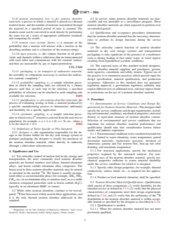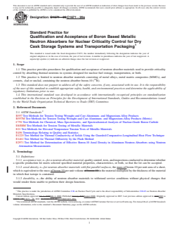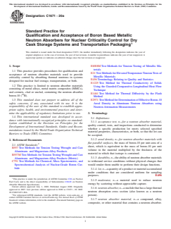 SIGNIFICANCE AND USE 4.1 For criticality control of nuclear fuel in dry storage and transportation, the most commonly used neutron absorber materials are borated stainless steel alloys, borated aluminum alloys, and boron carbide aluminum alloy composites. The boron used in these neutron absorber materials may be natural or enriched in the nuclide 10B. The boron is usually incorporated either as an intermetallic phase (for example, AlB2, TiB2, CrB2, etc.) in an aluminum alloy or stainless steel, or as a stable chemical compound particulate such as boron carbide (B4C), typically in an aluminum MMC or cermet. 4.2 While other neutron absorbers continue to be investigated, 10B has been most widely used in these applications, and it is the only thermal neutron absorber addressed in this standard. 4.3 In service, many neutron absorber materials are inaccessible and not amenable to a surveillance program. These neutron absorber materials are often expected to perform over an extended period. 4.4 Qualification and acceptance procedures demonstrate that the neutron absorber material has the necessary characteristics to perform its design functions during the service lifetime. 4.5 The criticality control function of neutron absorber materials in dry cask storage systems and transportation packagings is only significant in the presence of a moderator, such as during loading of fuel under water, or water ingress resulting from hypothetical accident conditions. 4.6 The expected users of this standard include designers, neutron absorber material suppliers and purchasers, government agencies, consultants and utility owners. Typical use of the practice is to summarize practices which provide input for design specification, material qualification, and production acceptance. Adherence to this standard does not guarantee regulatory approval; a government regulatory authority may require different tests or additional tests, and may impose limits or restrictions on the use of a neutron absorbe... SCOPE 1.1 This practice provides procedures for qualification and acceptance of neutron absorber materials used to provide criticality control by absorbing thermal neutrons in systems designed for nuclear fuel storage, transportation, or both. 1.2 This practice is limited to neutron absorber materials consisting of metal alloys, metal matrix composites (MMCs), and cermets, clad or unclad, containing the neutron absorber boron-10 (10B). 1.3 This standard does not purport to address all of the safety concerns, if any, associated with its use. It is the responsibility of the user of this standard to establish appropriate safety, health, and environmental practices and determine the applicability of regulatory limitations prior to use. 1.4 This international standard was developed in accordance with internationally recognized principles on standardization established in the Decision on Principles for the Development of International Standards, Guides and Recommendations issued by the World Trade Organization Technical Barriers to Trade (TBT) Committee.