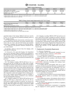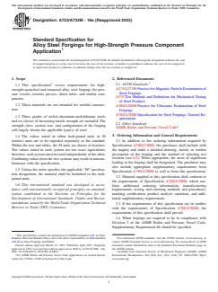 ASTM A723/A723M-18a(2023) is a technical specification published by ASTM International. Its full title is "Standard Specification for Alloy Steel Forgings for High-Strength Pressure Component Application". This standard covers: ABSTRACT This specification covers the standard requirements for high-strength quenched and tempered alloy steel forgings for pressure vessels, isostatic presses, shock tubes, and similar components. These materials are not intended for welded construction. Three grades of nickel-chromium-molybdenum steels and six classes of increasing tensile strength are included. The strength class, section size, and configuration of the forging will largely dictate the applicable type of steel. Materials shall be manufactured by steel melting processes, rough machining, and final heat treatment, which shall consist of normalizing, reaustenitization, liquid quenching, and tempering. Conformance of the forging specimens to chemical composition requirements shall be analyzed by heat and product analyses. Proper sampling methods for mechanical properties testing shall be done by any of four possible ways, as judged appropriate. Steel specimens shall also undergo straight-beam and angle-beam ultrasonic examination, and magnetic particle examination procedures to evaluate nondestructive examination requirements. Repair welding of the forgings shall not be permitted. SCOPE 1.1 This specification2 covers requirements for high-strength quenched and tempered alloy steel forgings for pressure vessels, isostatic presses, shock tubes, and similar components. 1.2 These materials are not intended for welded construction. 1.3 Three grades of nickel-chromium-molybdenum steels and six classes of increasing tensile strength are included. The strength class, section size, and configuration of the forging will largely dictate the applicable type(s) of steel. 1.4 The values stated in either inch-pound units or SI (metric) units are to be regarded separately as the standard. Within the text and tables, the SI units are shown in brackets. The values stated in each system are not exact equivalents; therefore, each system must be used independently of the other. Combining values from the two systems may result in nonconformance with the specification. 1.5 Unless the order specifies the applicable “M” specification designation, the material shall be furnished to the inch-pound units. 1.6 This international standard was developed in accordance with internationally recognized principles on standardization established in the Decision on Principles for the Development of International Standards, Guides and Recommendations issued by the World Trade Organization Technical Barriers to Trade (TBT) Committee.
