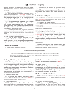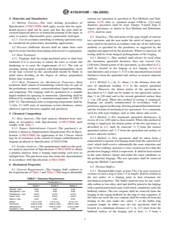 ABSTRACT This specification covers the standard requirements for high-strength quenched and tempered alloy steel forgings for pressure vessels, isostatic presses, shock tubes, and similar components. These materials are not intended for welded construction. Three grades of nickel-chromium-molybdenum steels and six classes of increasing tensile strength are included. The strength class, section size, and configuration of the forging will largely dictate the applicable type of steel. Materials shall be manufactured by steel melting processes, rough machining, and final heat treatment, which shall consist of normalizing, reaustenitization, liquid quenching, and tempering. Conformance of the forging specimens to chemical composition requirements shall be analyzed by heat and product analyses. Proper sampling methods for mechanical properties testing shall be done by any of four possible ways, as judged appropriate. Steel specimens shall also undergo straight-beam and angle-beam ultrasonic examination, and magnetic particle examination procedures to evaluate nondestructive examination requirements. Repair welding of the forgings shall not be permitted. SCOPE 1.1 This specification2 covers requirements for high-strength quenched and tempered alloy steel forgings for pressure vessels, isostatic presses, shock tubes, and similar components. 1.2 These materials are not intended for welded construction. 1.3 Three grades of nickel-chromium-molybdenum steels and six classes of increasing tensile strength are included. The strength class, section size, and configuration of the forging will largely dictate the applicable type(s) of steel. 1.4 The values stated in either inch-pound units or SI (metric) units are to be regarded separately as the standard. Within the text and tables, the SI units are shown in brackets. The values stated in each system are not exact equivalents; therefore, each system must be used independently of the other. Combining values from the two systems may result in nonconformance with the specification. 1.5 Unless the order specifies the applicable “M” specification designation, the material shall be furnished to the inch-pound units. 1.6 This international standard was developed in accordance with internationally recognized principles on standardization established in the Decision on Principles for the Development of International Standards, Guides and Recommendations issued by the World Trade Organization Technical Barriers to Trade (TBT) Committee.