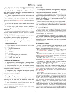 ASTM F1178-11(2022) is a technical specification published by ASTM International. Its full title is "Standard Specification for Performance of Enameling System, Baking, Metal Joiner Work and Furniture". This standard covers: ABSTRACT This specification covers performance of enameling system and baking primer on metal joiner work and furniture. Specification includes procedures for cleaning, degreasing, enameling, and texturing. Performance criteria shall include test panel description, primer test panel preparation, salt spray exposure, blistering resistance, corrosion resistance, enamel test panel preparation, gloss, hardness, paint cure, adhesion, flexibility, impact resistance, and color stability. SCOPE 1.1 This specification covers the performance of a baking primer and enamel on metal for use on fabricated metal products, including marine furniture and joiner work. 1.2 The values stated in inch-pound units are to be regarded as standard. The metric (SI) units, given in parentheses, are for information only. 1.3 Painting facilities shall comply with all applicable Federal and State regulations regarding emissions and waste disposal. 1.4 This standard does not purport to address all of the safety concerns, if any, associated with its use. It is the responsibility of the user of this standard to establish appropriate safety, health, and environmental practices and determine the applicability of regulatory limitations prior to use. 1.5 This international standard was developed in accordance with internationally recognized principles on standardization established in the Decision on Principles for the Development of International Standards, Guides and Recommendations issued by the World Trade Organization Technical Barriers to Trade (TBT) Committee.
