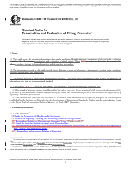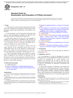 SIGNIFICANCE AND USE 4.1 It is important to be able to determine the extent of pitting, either in a service application in which it is necessary to predict the remaining life in a metal structure, or in laboratory test programs that are used to select the most pitting-resistant materials for service. The purpose of the study is crucial in determining the appropriate examination and evaluation steps. 4.2 Some typical purposes of laboratory tests include, but are not limited to, evaluating performance of alloys, determining whether an alloy is resistant to the environment, evaluating how environmental conditions including corrosion inhibitor affect or prevent pitting, and evaluating whether a lot of metal is sufficiently resistant for its use in a particular application or environment. 4.3 Some typical purposes of field studies include, but are not limited to, determining if pits are likely to grow and cause leak or release of process fluid, and assisting a determination of whether to replace or repair damage from pits (remaining life assessment). SCOPE 1.1 This guide covers the selection of procedures that can be used in the examination and evaluation of pitted metals. These procedures include both nondestructive and destructive approaches. 1.2 The procedures covered in this guide include those that may be used in laboratory evaluations of corroded metal specimens and field examinations and inspections. 1.3 The values stated in SI units are to be regarded as standard. The values given in parentheses after SI units are provided for information only and are not considered standard. 1.3.1 Exception—In X1.2.1, mils per year (MPY) are regarded as standard for the target corrosion rate. 1.4 This standard does not purport to address all of the safety concerns, if any, associated with its use. It is the responsibility of the user of this standard to establish appropriate safety, health, and environmental practices and determine the applicability of regulatory limitations prior to use. 1.5 This international standard was developed in accordance with internationally recognized principles on standardization established in the Decision on Principles for the Development of International Standards, Guides and Recommendations issued by the World Trade Organization Technical Barriers to Trade (TBT) Committee.