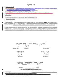 ASTM G46-21 is a guide published by ASTM International. Its full title is "Standard Guide for Examination and Evaluation of Pitting Corrosion". This standard covers: SIGNIFICANCE AND USE 4.1 It is important to be able to determine the extent of pitting, either in a service application in which it is necessary to predict the remaining life in a metal structure, or in laboratory test programs that are used to select the most pitting-resistant materials for service. The purpose of the study is crucial in determining the appropriate examination and evaluation steps. 4.2 Some typical purposes of laboratory tests include, but are not limited to, evaluating performance of alloys, determining whether an alloy is resistant to the environment, evaluating how environmental conditions including corrosion inhibitor affect or prevent pitting, and evaluating whether a lot of metal is sufficiently resistant for its use in a particular application or environment. 4.3 Some typical purposes of field studies include, but are not limited to, determining if pits are likely to grow and cause leak or release of process fluid, and assisting a determination of whether to replace or repair damage from pits (remaining life assessment). SCOPE 1.1 This guide covers the selection of procedures that can be used in the examination and evaluation of pitted metals. These procedures include both nondestructive and destructive approaches. 1.2 The procedures covered in this guide include those that may be used in laboratory evaluations of corroded metal specimens and field examinations and inspections. 1.3 The values stated in SI units are to be regarded as standard. The values given in parentheses after SI units are provided for information only and are not considered standard. 1.3.1 Exception—In X1.2.1, mils per year (MPY) are regarded as standard for the target corrosion rate. 1.4 This standard does not purport to address all of the safety concerns, if any, associated with its use. It is the responsibility of the user of this standard to establish appropriate safety, health, and environmental practices and determine the applicability of regulatory limitations prior to use. 1.5 This international standard was developed in accordance with internationally recognized principles on standardization established in the Decision on Principles for the Development of International Standards, Guides and Recommendations issued by the World Trade Organization Technical Barriers to Trade (TBT) Committee.