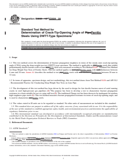 SCOPE 1.1 This test method covers the determination of fracture propagation toughness in terms of the steady-state crack-tip-opening angle (CTOA) using the drop-weight tear test (DWTT)-type specimen. The method is applicable to ferritic steels that exhibit predominantly ductile fracture with at least 85 % shear area measured according to Test Method E436 - Standard Test Method for Drop-Weight Tear Tests of Ferritic Steels. This test method applies to ferritic steels with thicknesses between 6 mm and 20 mm. Annex A1 describes the method to test ferritic steels with thicknesses between 20 mm to 32 mm. 1.2 In terms of apparatus, specimen design, and test methodology, this test method draws from Test Method E436 and API 5L3 - Recommended Practice for Conducting Drop-Weight Tear Tests on Line Pipe. 1.3 The development of this test method has been driven by the need to design for fast ductile fracture arrest of axial running cracks in steel high-pressure gas pipelines (1). 2The purpose has been to develop a test to characterize fracture propagation resistance in a form suitable for use as a pipe mill test (2). The traditional Charpy test has been shown to be inadequate for modern high toughness pipe steels (1). This test method measures fracture propagation resistance in terms of crack-tip opening angle, and is used to characterize ferritic steels. 1.4 The values stated in SI units are to be regarded as standard. No other units of measurement are included in this standard. 1.5 This standard does not purport to address all of the safety concerns, if any, associated with its use. It is the responsibility of the user of this standard to establish appropriate safety, health, and environmental practices and determine the applicability of regulatory limitations prior to use. 1.6 This international standard was developed in accordance with internationally recognized principles on standardization established in the Decision on Principles for the Development of International Standards, Guides and Recommendations issued by the World Trade Organization Technical Barriers to Trade (TBT) Committee.