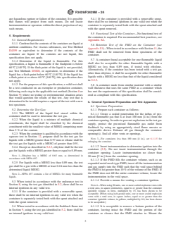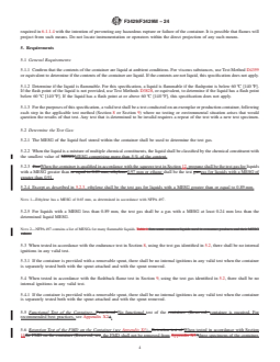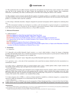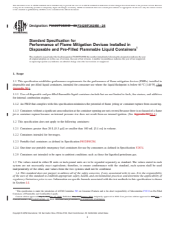 SCOPE 1.1 This specification establishes performance requirements for the performance of flame mitigation devices (FMDs) installed in disposable and pre-filled liquid containers, intended for consumer use where the liquid flashpoint is below 60 ºC [140 ºF]. (See Appendix X1.) 1.1.1 Uses of disposable and pre-filled flammable liquid containers include but are not limited to fuels, fire starters, and additives for internal combustion engines. 1.1.2 An FMD that complies with this specification minimizes the potential of flame jetting or container rupture from occurring. 1.1.3 Containers without a significant area reduction at the container opening are not covered because there is no hazard of a flame jet or container rupture because an internal pressure rise does not result from an internal ignition. (See X1.5.) 1.2 This specification does not apply to the following containers: 1.2.1 Containers greater than 20 L [5.3 gal] or smaller than 100 mL [3.4 oz] in volume. 1.2.2 Containers intended for beverages. 1.2.3 Portable fuel containers as defined in Specification F852/F852M. 1.2.4 One-time use portable emergency fuel containers for use by consumers as defined in Specification F2874. 1.2.5 Containers not intended to be open to ambient conditions such as those for liquefied petroleum gas. 1.3 The values stated in either SI units or inch-pound units are to be regarded separately as standard. The values stated in each system are not necessarily exact equivalents; therefore, to ensure conformance with the standard, each system shall be used independently of the other, and values from the two systems shall not be combined. 1.4 This standard does not purport to address all of the safety concerns, if any, associated with its use. It is the responsibility of the user of this standard to establish appropriate safety, health, and environmental practices and determine the applicability of regulatory limitations prior to use. Information on specific hazards associated with the test methods in this specification is shown in Section 4.4. 1.5 This specification does not address hazards caused by fire and explosion nor hazards from vapors external to the container when the fuel in the container does not ignite. Further, this specification does not consider scenarios where confinement, obstructions, or preheating cause flame acceleration prior to the flame front reaching the interior of the container. 1.6 This standard is used to measure and describe the response of materials, products, or assemblies to heat and flame under controlled conditions, but does not by itself incorporate all factors required for fire-hazard or fire-risk assessment of the materials, products, or assemblies under actual fire conditions. 1.7 Fire testing is inherently hazardous. Adequate safeguards for personnel and property shall be employed in conducting these tests. 1.8 This international standard was developed in accordance with internationally recognized principles on standardization established in the Decision on Principles for the Development of International Standards, Guides and Recommendations issued by the World Trade Organization Technical Barriers to Trade (TBT) Committee.
