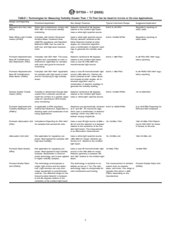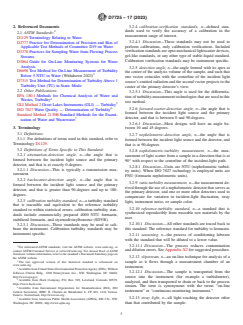 SIGNIFICANCE AND USE 4.1 Turbidity is undesirable in drinking water, plant effluent waters, water for food and beverage processing, and for a large number of other water dependent manufacturing processes. Removal of suspended matter is accomplished by coagulation, settling, and filtration. Measurement of turbidity provides a rapid means of process control to determine when, how, and to what extent the water must be treated to meet specifications. 4.2 This test method is suitable for the on-line monitoring of turbidity such as that found in drinking water, process water, and high purity industrial waters. 4.3 The instrumentation used must allow for the continuous on-line monitoring of a sample stream. 4.4 When reporting the measured result, appropriate units should also be reported. The units are reflective of the technology used to generate the result, and if necessary, provide more adequate comparison to historical data sets. 4.4.1 Table 1 describing technologies and reporting results. Those technologies listed are appropriate for the range of measurement prescribed in this test method are mentioned, though others may come available. Fig. X3.1 from Appendix X3 contains a flowchart to assist in technology selection. 4.4.2 For a specific design that falls outside of these reporting ranges, the turbidity should be reported in TU with a subscripted wavelength value to characterize the light source that was used. 4.4.3 Ratio white light turbidimeters are common as bench top instruments but not as a typical process instrument. However, if fitted with a flow-cell they meet the criteria of this test method. SCOPE 1.1 This test method covers the on-line and in-line determination of high-level turbidity in water that is greater than 1.0 turbidity units (TU) in municipal, industrial and environmental usage. 1.2 In principle, there are three basic applications for on-line measurement set ups. This first is the slipstream (bypass) sample technique. For the slipstream sample technique a portion of sample is transported out of the process and through the measurement apparatus. It is then either transported back to the process or to waste. The second is the in-line measurement where the sensor is brought directly into the process (see Fig. 8). The third basic method is for in-situ monitoring of sample waters. This principle is based on the insertion of a sensor into the sample itself as the sample is being processed. The in-situ use in this test method is intended for the monitoring of water during any step within a processing train, including immediately before or after the process itself. 1.3 This test method is applicable to the measurement of turbidities greater than 1.0 TU. The absolute range is dictated by the technology that is employed. 1.4 The upper end of the measurement range is left undefined because different technologies described in this test method can cover very different ranges of turbidity. 1.5 Many of the turbidity units and instrument designs covered in this test method are numerically equivalent in calibration when a common calibration standard is applied across those designs listed in Table 1. Measurement of a common calibration standard of a defined value will also produce equivalent results across these technologies. This test method prescribes the assignment of a determined turbidity values to the technology used to determine those values. Numerical equivalence to turbidity standards is observed between different technologies but is not expected across a common sample. Improved traceability beyond the scope of this test method may be practiced and would include the listing of the make and model number of the instrument used to determine the turbidity values. 1.5.1 In this test method, calibration standards are often defined in NTU values, but the other assigned turbidity units, such as those in Table 1 are equivalent. For example, a 1 NTU formazin standard is also a 1...