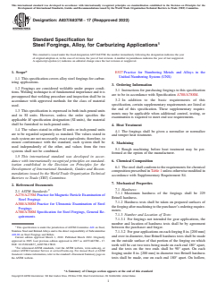 ASTM A837/A837M-17(2022) is a technical specification published by ASTM International. Its full title is "Standard Specification for Steel Forgings, Alloy, for Carburizing Applications". This standard covers: ABSTRACT This specification covers alloy steel forgings for carburizing applications. Forgings shall be considered weldable under proper conditions. Materials shall go through normalize, or normalize and temper heat treatment, prior to which rough machining may be performed at the option of the manufacturer. Each grade designation of steel shall conform to specified chemical compositions of carbon, manganese, phosphorus, sulfur, silicon, nickel, chromium, molybdenum, and copper. Hardness tests shall be conducted as well. SCOPE 1.1 This specification covers alloy steel forgings for carburizing applications. 1.2 Forgings are considered weldable under proper conditions. Welding technique is of fundamental importance and it is presupposed that welding procedure and inspection shall be in accordance with approved methods for the class of material used. 1.3 This specification is expressed in both inch-pound units and in SI units. However, unless the order specifies the applicable M specification designation (SI units), the material shall be furnished to inch-pound units. 1.4 The values stated in either SI units or inch-pound units are to be regarded separately as standard. The values stated in each system are not necessarily exact equivalents; therefore, to ensure conformance with the standard, each system shall be used independently of the other, and values from the two systems shall not be combined. 1.5 This international standard was developed in accordance with internationally recognized principles on standardization established in the Decision on Principles for the Development of International Standards, Guides and Recommendations issued by the World Trade Organization Technical Barriers to Trade (TBT) Committee.