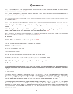 ABSTRACT This specification establishes the nationally recognized performance requirements and associated test methods for portable gasoline containers intended for use and reuse by consumers. It does not cover single-trip prepackaged containers. The containers shall show evidence of good workmanship and, when appropriately tested, shall meet specified requirements for color, capacity, stability, handle strength, drop strength, internal hydrostatic pressure, openings and closure, components, and durability in terms of aging, permeability, gasoline resistance, stress cracking, corrosion resistance, and heat resistance and flammability. SCOPE 1.1 This specification establishes performance requirements for portable gasoline, kerosene, and diesel containers intended for reuse by the consumer. This specification also covers reusable containers for gas/oil mixtures commonly used for two-cycle engines and reusable dual-compartment containers for separate gas and oil storage. 1.2 This specification is not a fire hazard standard, but a specification for portable gasoline, kerosene, and diesel containers for consumer use. 1.3 This specification defines performance requirements for systems that can effectively reduce fuel spillage and emissions when used in accordance with the manufacturer’s (marked) warnings, operating instructions, and limitations of use. This specification does not provide assurance that systems meeting the requirements are suited to all fueling applications and conditions. 1.4 Units—The values stated in either SI units or inch-pound units are to be regarded separately as standard. The values stated in each system are not necessarily exact equivalents; therefore, each system shall be used independently of the other. Combining values from the two systems has the potential to result in non-conformance with the standard. 1.5 The following precautionary caveat applies only to the Test Method portion, Section 7, of this specification: This standard does not purport to address all of the safety concerns, if any, associated with its use. It is the responsibility of the user of this standard to establish appropriate safety, health, and environmental practices and determine the applicability of regulatory limitations prior to use. See Section 6 for additional precautionary information. 1.6 This international standard was developed in accordance with internationally recognized principles on standardization established in the Decision on Principles for the Development of International Standards, Guides and Recommendations issued by the World Trade Organization Technical Barriers to Trade (TBT) Committee.