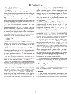 ASTM F852/F852M-22 is a technical specification published by ASTM International. Its full title is "Standard Specification for Portable Gasoline, Kerosene, and Diesel Containers for Consumer Use". This standard covers: ABSTRACT This specification establishes the nationally recognized performance requirements and associated test methods for portable gasoline containers intended for use and reuse by consumers. It does not cover single-trip prepackaged containers. The containers shall show evidence of good workmanship and, when appropriately tested, shall meet specified requirements for color, capacity, stability, handle strength, drop strength, internal hydrostatic pressure, openings and closure, components, and durability in terms of aging, permeability, gasoline resistance, stress cracking, corrosion resistance, and heat resistance and flammability. SCOPE 1.1 This specification establishes performance requirements for portable gasoline, kerosene, and diesel containers intended for reuse by the consumer. This specification also covers reusable containers for gas/oil mixtures commonly used for two-cycle engines and reusable dual-compartment containers for separate gas and oil storage. 1.2 This specification is not a fire hazard standard, but a specification for portable gasoline, kerosene, and diesel containers for consumer use. 1.3 This specification defines performance requirements for systems that can effectively reduce fuel spillage and emissions when used in accordance with the manufacturer’s (marked) warnings, operating instructions, and limitations of use. This specification does not provide assurance that systems meeting the requirements are suited to all fueling applications and conditions. 1.4 Units—The values stated in either SI units or inch-pound units are to be regarded separately as standard. The values stated in each system are not necessarily exact equivalents; therefore, each system shall be used independently of the other. Combining values from the two systems has the potential to result in non-conformance with the standard. 1.5 The following precautionary caveat applies only to the Test Method portion, Section 7, of this specification: This standard does not purport to address all of the safety concerns, if any, associated with its use. It is the responsibility of the user of this standard to establish appropriate safety, health, and environmental practices and determine the applicability of regulatory limitations prior to use. See Section 6 for additional precautionary information. 1.6 This international standard was developed in accordance with internationally recognized principles on standardization established in the Decision on Principles for the Development of International Standards, Guides and Recommendations issued by the World Trade Organization Technical Barriers to Trade (TBT) Committee.