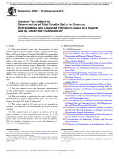ASTM D7551-10(2015) is a standard published by ASTM International. Its full title is "Standard Test Method for Determination of Total Volatile Sulfur in Gaseous Hydrocarbons and Liquefied Petroleum Gases and Natural Gas by Ultraviolet Fluorescence". This standard covers: SIGNIFICANCE AND USE 5.1 The sulfur content of gaseous hydrocarbons, LPG, and LNG used for fuel purposes contributes to total SOx emissions and can lead to corrosion in engine and exhaust systems. Some process catalysts used in petroleum and chemical refining can be poisoned by trace amounts of sulfur-bearing materials in the feed stocks. This test method can be used to determine the total volatile sulfur content in process feeds, to control the total volatile sulfur content in finished products and, as applicable, to meet regulatory requirements. Practice D1072 has previously been used for the measurement of total sulfur in gaseous fuels. SCOPE 1.1 This test method covers the determination of total volatile sulfur in gaseous hydrocarbons, Liquefied Petroleum Gases (LPG) and Liquefied Natural Gas (LNG). It is applicable to analysis of natural gaseous fuels, process intermediates, final product hydrocarbons and generic gaseous fuels containing sulfur in the range of 1 to 200 mg/kg. Samples can also be tested at other total sulfur levels using either pre-concentration methods or sample dilution using a diluent gas. The methodology for preconcentration and dilution techniques is not covered in this test method. The precision statement does not apply if these techniques are used in conjunction with this test method. The diluent gas, such as UHP nitrogen, zero nitrogen or zero air, shall not have a significant total sulfur concentration. 1.2 This test method may not detect sulfur compounds that do not volatilize under the conditions of the test. 1.3 This test method covers the laboratory determination and the at-line/on-line determination of total volatile sulfur in gaseous fuels, LPG, and LNG. 1.4 This test method is applicable for total volatile sulfur determination in gaseous hydrocarbons, LPG, and LNG containing less than 0.35 mole % halogen(s). 1.5 The values stated in SI units are to be regarded as standard. No other units of measurement are included in this standard. 1.6 This standard does not purport to address all of the safety concerns, if any, associated with its use. It is the responsibility of the user of this standard to establish appropriate safety and health practices and determine the applicability of regulatory limitations prior to use. See Sections 4.1, 7.3, 7.4, 11.2, and Section 8.
