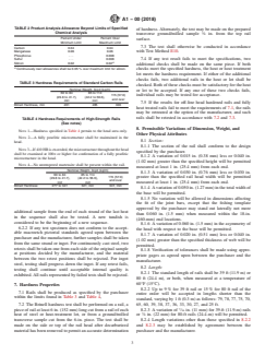 ABSTRACT This specification deals with carbon steel tee rails for use in railway track, including export and industrial applications. Rails shall be furnished by as-rolling, head hardening, or fully heat treatment processes. Hydrogen content shall be measured either during the continuous casting process or during ingot teeming. The rails shall conform to the chemical requirements for carbon, manganese, phosphorus, sulfur, and silicon. Rail soundness shall be evaluated by macroetch testing for both ingot and continuously cast steel. The rails shall conform to the Brinell hardness test requirements for standard carbon rails and high-strength rails. SCOPE 1.1 This specification covers carbon steel tee rails of nominal weights of 60 lb/yd (29.8 kg/m) and over for use in railway track, including export and industrial applications. 1.2 Supplementary requirements S1 and S2 shall apply only when specified by the purchaser in the order. 1.3 The values stated in inch-pound units are to be regarded as standard. The values given in parentheses are mathematical conversions to SI units that are provided for information only and are not considered standard. 1.4 This international standard was developed in accordance with internationally recognized principles on standardization established in the Decision on Principles for the Development of International Standards, Guides and Recommendations issued by the World Trade Organization Technical Barriers to Trade (TBT) Committee.