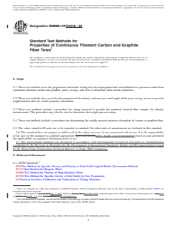 SIGNIFICANCE AND USE 5.1 The properties determined by these test methods are of value in material specifications, qualifications, data base generation, certification, research, and development. 5.2 These test methods are intended for the testing of fibers that have been specifically developed for use as reinforcing agents in advanced composite structures. The test results of an impregnated and consolidated fiber should be representative of the strength and modulus that are available in the material when used as intended. The performance of fibers in different resin systems can vary significantly so that correlations between results using these test methods and composite testing may not always be obtained. 5.3 The reproducibility of test results is dependent upon precise control over all test conditions. Resin type, content and distribution, curing process, filament alignment, gripping in the testing machine, and alignment in the testing machine are of special importance. 5.4 The measured strengths of fibers are not unique quantities and test results are strongly dependent on the test methods used. Therefore the test method described here will not necessarily give the same mean strengths or standard deviations as those obtained from single filaments, dry fibers, composite laminas, or composite laminates. SCOPE 1.1 These test methods cover the preparation and tensile testing of resin-impregnated and consolidated test specimens made from continuous filament carbon and graphite yarns, rovings, and tows to determine their tensile properties. 1.2 These test methods also cover the determination of the density and mass per unit length of the yarn, roving, or tow to provide supplementary data for tensile property calculation. 1.3 These test methods include a procedure for sizing removal to provide the preferred desized fiber samples for density measurement. This procedure may also be used to determine the weight percent sizing. 1.4 These test methods include a procedure for determining the weight percent moisture adsorption of carbon or graphite fiber. 1.5 The values stated in SI units are to be regarded as standard. No other units of measurement are included in this standard. 1.6 This standard does not purport to address all of the safety concerns, if any, associated with its use. It is the responsibility of the user of this standard to establish appropriate safety, health, and environmental practices and determine the applicability of regulatory limitations prior to use. 1.7 This international standard was developed in accordance with internationally recognized principles on standardization established in the Decision on Principles for the Development of International Standards, Guides and Recommendations issued by the World Trade Organization Technical Barriers to Trade (TBT) Committee.