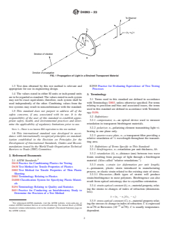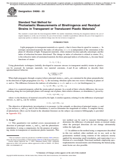 SIGNIFICANCE AND USE 5.1 The observation and measurement of strains in transparent or translucent materials is extensively used in various modeling techniques of experimental stress analysis. 5.2 Internal strains induced in manufacturing processes such as casting, molding, welding, extrusion, and polymer stretching can be assessed and parts exhibiting excessive strains identified. Such measurements can lead to elimination of defective parts, process improvement, control of annealing operation, etc. 5.3 When testing for physical properties, polariscopic examination of specimens is required, to eliminate those specimens exhibiting abnormal internal strain level (or defects). For example: Test Methods D638 (Note 8) and D882 (Note 11) recommend a polariscopic examination. 5.4 The birefringence of oriented polymers can be related to orientation, shrinkage, etc. The measurements of birefringence aid in characterization of these polymers. 5.5 For many materials, there may be a specification that requires the use of this test method, but with some procedural modifications that take precedence when adhering to the specification. Therefore, it is advisable to refer to that material specification before using this test method. Table 1 of Classification System D4000 lists the ASTM materials standards that currently exist. SCOPE 1.1 This quantitative test method covers measurements of direction of principal strains, ε1 and ε2, and the photoelastic retardation, δ, using a compensator, for the purpose of analyzing strains in transparent or translucent plastic materials. This test method can be used to measure birefringence and to determine the difference of principal strains or normal strains when the principal directions do not change substantially within the light path. 1.2 In addition to the method using a compensator described in this test method, other methods are in use, such as the goniometric method (using rotation of the analyzer) mostly applied for measuring small retardation, and expressing it as a fraction of a wavelength. Nonvisual methods employing spectrophotometric measurements and eliminating the human judgment factor are also possible. 1.3 Test data obtained by this test method is relevant and appropriate for use in engineering design. 1.4 The values stated in either SI units or inch-pound units are to be regarded as standard. The values stated in each system may not be exact equivalents; therefore, each system shall be used independently of the other. Combining values from the two systems may result in nonconformance with the standard. 1.5 This standard does not purport to address all of the safety concerns, if any, associated with its use. It is the responsibility of the user of this standard to establish appropriate safety, health, and environmental practices and determine the applicability of regulatory limitations prior to use. Note 1: There is no known ISO equivalent to this test method. 1.6 This international standard was developed in accordance with internationally recognized principles on standardization established in the Decision on Principles for the Development of International Standards, Guides and Recommendations issued by the World Trade Organization Technical Barriers to Trade (TBT) Committee.