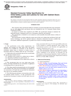 ASTM F3492-21 is a technical specification published by ASTM International. Its full title is "Standard Consumer Safety Specification for Child Safety Locks and Latches for Use with Cabinet Doors and Drawers". This standard covers: SCOPE 1.1 This specification covers safety requirements, test methods, and warnings for child safety locks and latches intended to be installed by consumers to the interior of residential cabinet doors or drawers to restrict access to household cabinets by children under the age of 48 months. 1.2 Child safety locks and latches that are not covered under this specification include devices: 1.2.1 Installed on the exterior of a cabinet door or drawer, 1.2.2 Requiring installation by professionals, or 1.2.3 That are an integral part of the cabinet door or drawer system. 1.3 This specification does not cover child safety locks, latches, and straps intended for use on furniture or appliances as anchoring devices to prevent tip over. 1.4 The values stated in inch-pound units are to be regarded as the standard. The values given in parentheses are mathematical conversions to SI units that are provided for information only and are not considered standard. 1.5 The following precautionary caveat pertains only to the test methods portion, Section 7, of this specification: This standard does not purport to address all of the safety concerns, if any, associated with its use. It is the responsibility of the user of this standard to establish appropriate safety, health, and environmental practices and determine the applicability of regulatory limitations prior to use. 1.6 This international standard was developed in accordance with internationally recognized principles on standardization established in the Decision on Principles for the Development of International Standards, Guides and Recommendations issued by the World Trade Organization Technical Barriers to Trade (TBT) Committee.