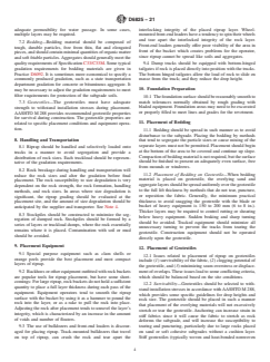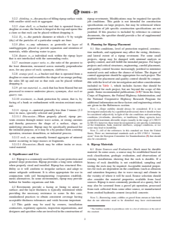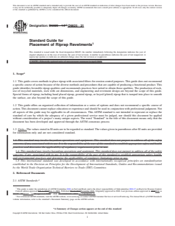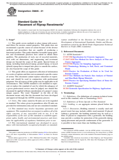 SIGNIFICANCE AND USE 4.1 Riprap is a commonly used form of scour protection and general slope protection. Riprap provides a long term solution when properly sized and installed. Riprap has structural flexibility so it will conform to irregular surfaces and adapt to minor subgrade settlement. It is often appropriate for use in conjunction with soil bioengineering (vegetation establishment) alternatives. In some environments, riprap may provide habitat for benthic organisms and fish. 4.2 Revetments provide a facing or lining to armor a surface; and the layer thickness is typically minimized while providing the necessary resistance to scour. In this case, standardized practices to obtain consistent coverage having acceptable thickness tolerances and voids become important. 4.3 This guide may be used by owners, installation contractors, regulatory agencies, inspection organizations, and designers and specifiers who are involved in the construction of riprap revetments. Modifications may be required for specific job conditions. This guide is not intended for construction specifications on large projects, but may be referenced where preparation of job specific construction specifications are not justified. If this practice is included by reference in contract documents, the specifier should provide a list of supplemental requirements. SCOPE 1.1 This guide covers methods to place riprap with associated filters for erosion control purposes. This guide does not recommend a specific course of action because of the diverse methods and procedures that are capable of producing a functional product. This guide identifies favorable riprap qualities and recommends practices best suited to obtain those qualities. The production of rock, use of recycled materials, rock with cut dimensions, and engineering and revetment design are beyond the scope of this guide. Special forms of riprap, including hand placed riprap, grouted riprap, or keyed (plated) riprap that is tamped into place to smooth the surface, are also beyond the scope of this guide. 1.2 This guide offers an organized collection of information or a series of options and does not recommend a specific course of action. This document cannot replace education or experience and should be used in conjunction with professional judgment. Not all aspects of this guide may be applicable in all circumstances. This ASTM standard is not intended to represent or replace the standard of care by which the adequacy of a given professional service must be judged, nor should this document be applied without consideration of a project's many unique aspects. The word “Standard” in the title of this document means only that the document has been developed and approved through the ASTM consensus process 1.3 Units—The values stated in SI units are to be regarded as standard. The values given in parentheses after SI units are provided for information only and are not considered standard. 1.4 This standard may involve hazardous operations and equipment. This standard does not purport to address all of the safety concerns, if any, associated with its use. It is the responsibility of the user of this standard to establish appropriate safety, health, and environmental practices and determine the applicability of regulatory limitations prior to use. 1.5 This international standard was developed in accordance with internationally recognized principles on standardization established in the Decision on Principles for the Development of International Standards, Guides and Recommendations issued by the World Trade Organization Technical Barriers to Trade (TBT) Committee.