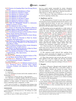 ASTM D1971-16(2021)e1 is a standard published by ASTM International. Its full title is "Standard Practices for Digestion of Water Samples for Determination of Metals by Flame Atomic Absorption, Graphite Furnace Atomic Absorption, Plasma Emission Spectroscopy, or Plasma Mass Spectrometry". This standard covers: SIGNIFICANCE AND USE 4.1 The determination of metals in water often requires the measurement of total (suspended and dissolved) metals as well as soluble (dissolved) metals. In such cases, consistent and dependable digestion procedures must be used so that data derived for the total metals content is reliable. 4.2 The practices given are applicable to a wide variety of sample types for the purpose of preparing a sample for metals analyses by atomic absorption spectrophotometry or plasma emission spectroscopy (see Test Method D1976, Practice D3919, Practice D4691, and Test Method D4190) or plasma-mass spectrometry (see Test Method D5673) and have been shown to give good recovery in the following matrices: industrial effluents; waste water treatment plant influents, sludges, dewatered sludges, and effluents; river and lake waters; and plant and animal tissues. Elements which have shown good recovery include: copper, nickel, lead, zinc, cadmium, iron, manganese, magnesium, and calcium. 4.2.1 Good recovery for the indicated sample types and metals may not be achieved at all times due to each sample's unique characteristics. Users must always validate the practice for their particular samples. 4.3 The analytical results achieved after applying these practices cannot necessarily be deemed as a measure of bioavailable or environmentally available elements. 4.4 These three practices may not give the same recovery when applied to the same sample, nor will they necessarily give the same results as achieved using other digestion techniques. An alternate digestion technique is Practice D4309. SCOPE 1.1 Most atomic absorption and plasma emission spectroscopy, and plasma-mass spectrometric test methods require that the metals of interest be dissolved in a liquid phase before being introduced into the spectrophotometer. These practices describe digestion or dissolution procedures whereby analyte metals associated with the solid fraction of a sample can be brought into solution for subsequent analysis. The following practices are included: Sections Practice A—Digestion with Mineral Acids and Elevated Pressure 8 through 13 Practice B—Digestion with Mineral Acids and Heating at Atmospheric Pressure 14 through 19 Practice C—In-Bottle Digestion with Mineral Acids 20 through 25 1.2 These practices have been demonstrated to be applicable to a wide variety of sample types and sample matrices, and in many cases, will give complete dissolution of the analyte metals of interest. They are by no means the only digestion procedures available. 1.3 The user of these practices should be cautioned that these practices may not completely dissolve all portions of a sample's solid phase and may not give complete recovery of the desired analyte metals. In these cases, other digestion techniques are available that will effect complete dissolution of a sample. It is the user's responsibility to ensure the validity of these practices for use on their particular sample matrix, for their metals of interest. 1.4 This practice assumes that the criteria established in Guide D3856 can be met. 1.5 These digestion procedures have been selected for their wide application, low cost, and ease of use. 1.6 The values stated in SI units are to be regarded as the standard. The values given in parentheses are mathematical conversion to inch-pound units that are provided for information only and are not considered standard. 1.7 This standard does not purport to address all of the safety concerns, if any, associated with its use. It is the responsibility of the user of this standard to establish appropriate safety, health, and environmental practices and determine the applicability of regulatory limitations prior to use. Specific hazard statements are given in Section 6. 1.8 This international standard was developed in accordance with internationally recognized principles on standardization establi...