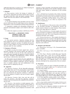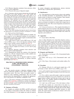 SIGNIFICANCE AND USE 4.1 The determination of metals in water often requires the measurement of total (suspended and dissolved) metals as well as soluble (dissolved) metals. In such cases, consistent and dependable digestion procedures must be used so that data derived for the total metals content is reliable. 4.2 The practices given are applicable to a wide variety of sample types for the purpose of preparing a sample for metals analyses by atomic absorption spectrophotometry or plasma emission spectroscopy (see Test Method D1976, Practice D3919, Practice D4691, and Test Method D4190) or plasma-mass spectrometry (see Test Method D5673) and have been shown to give good recovery in the following matrices: industrial effluents; waste water treatment plant influents, sludges, dewatered sludges, and effluents; river and lake waters; and plant and animal tissues. Elements which have shown good recovery include: copper, nickel, lead, zinc, cadmium, iron, manganese, magnesium, and calcium. 4.2.1 Good recovery for the indicated sample types and metals may not be achieved at all times due to each sample's unique characteristics. Users must always validate the practice for their particular samples. 4.3 The analytical results achieved after applying these practices cannot necessarily be deemed as a measure of bioavailable or environmentally available elements. 4.4 These three practices may not give the same recovery when applied to the same sample, nor will they necessarily give the same results as achieved using other digestion techniques. An alternate digestion technique is Practice D4309. SCOPE 1.1 Most atomic absorption and plasma emission spectroscopy, and plasma-mass spectrometric test methods require that the metals of interest be dissolved in a liquid phase before being introduced into the spectrophotometer. These practices describe digestion or dissolution procedures whereby analyte metals associated with the solid fraction of a sample can be brought into solution for subsequent analysis. The following practices are included: Sections Practice A—Digestion with Mineral Acids and Elevated Pressure 8 through 13 Practice B—Digestion with Mineral Acids and Heating at Atmospheric Pressure 14 through 19 Practice C—In-Bottle Digestion with Mineral Acids 20 through 25 1.2 These practices have been demonstrated to be applicable to a wide variety of sample types and sample matrices, and in many cases, will give complete dissolution of the analyte metals of interest. They are by no means the only digestion procedures available. 1.3 The user of these practices should be cautioned that these practices may not completely dissolve all portions of a sample's solid phase and may not give complete recovery of the desired analyte metals. In these cases, other digestion techniques are available that will effect complete dissolution of a sample. It is the user's responsibility to ensure the validity of these practices for use on their particular sample matrix, for their metals of interest. 1.4 This practice assumes that the criteria established in Guide D3856 can be met. 1.5 These digestion procedures have been selected for their wide application, low cost, and ease of use. 1.6 The values stated in SI units are to be regarded as the standard. The values given in parentheses are mathematical conversion to inch-pound units that are provided for information only and are not considered standard. 1.7 This standard does not purport to address all of the safety concerns, if any, associated with its use. It is the responsibility of the user of this standard to establish appropriate safety, health, and environmental practices and determine the applicability of regulatory limitations prior to use. Specific hazard statements are given in Section 6. 1.8 This international standard was developed in accordance with internationally recognized principles on standardization establi...