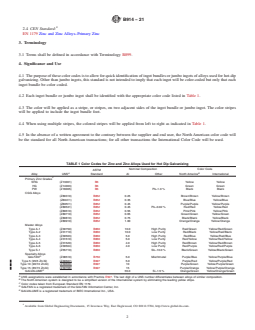 SIGNIFICANCE AND USE 4.1 The purpose of these color codes is to allow for quick identification of ingot bundles or jumbo ingots of alloys used for hot-dip galvanizing. Other than jumbo ingots, this standard is not intended to imply that each ingot will be color-coded but only that each ingot bundle be color coded. 4.2 Each ingot bundle or jumbo ingot shall be identified with the appropriate color code listed in Table 1. (A) UNS assignations were established in accordance with Practice E527. The last digit of a UNS number differentiates between alloys of similar composition.(B) The North American system is designed to be a simplified version of the International system by eliminating the leading yellow stripe.(C) Color codes taken from European Standard EN 1179.(D) GALFAN is a registered trademark of the GALFAN Information Center, Inc.(E) GALVALUME is a registered trademark of BIEC International Inc., USA. 4.3 The color will be applied as a stripe, or stripes, on two adjacent sides of the ingot bundle or jumbo ingot. The color stripes will be applied to include the ingot bundle foot. 4.4 When using multiple stripes, the colored stripes will be applied from left to right as indicated in Table 1. 4.5 In the absence of a written agreement to the contrary between the supplier and end user, the North American color code will be the standard for all North American transactions; for all other transactions the International Color Code will be used. SCOPE 1.1 This standard is published with the following objectives: 1.1.1 To establish standard color codes for zinc, zinc alloy and zinc master alloy ingot used by the Hot-Dip Galvanizing industry, and 1.1.2 To standardize the use and application of these color codes. 1.2 This standard does not purport to address all of the safety concerns, if any, associated with its use. It is the responsibility of the user of this standard to become familiar with all hazards including those identified in the appropriate Safety Data Sheet (SDS) for this product/material as provided by the manufacturer, to establish appropriate safety, health, and environmental practices, and determine the applicability of regulatory limitations prior to use. 1.3 This international standard was developed in accordance with internationally recognized principles on standardization established in the Decision on Principles for the Development of International Standards, Guides and Recommendations issued by the World Trade Organization Technical Barriers to Trade (TBT) Committee.