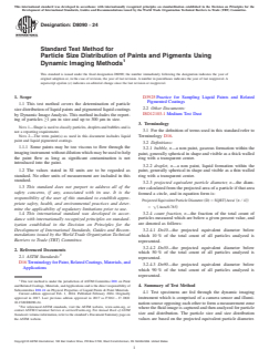 ASTM D8090-24 is a standard published by ASTM International. Its full title is "Standard Test Method for Particle Size Distribution of Paints and Pigments Using Dynamic Imaging Methods". This standard covers: SIGNIFICANCE AND USE 5.1 By following this test method, the particle size, particle size distribution and particle shape of particulates in liquid paint and pigment dispersions can be measured. 5.2 Particle size, particle size distribution and particle shape have a great effect on the color, opacity and gloss of paints. Reproducing these characteristics is critical to the quality and performance of the paint produced. 5.3 The dynamic imaging instrument is useful during manufacturing to detect oversize particles as well as the required size distribution of particles in order to provide quality and consistency from batch to batch. SCOPE 1.1 This test method covers the determination of particle size distribution of liquid paints and pigmented liquid coatings by Dynamic Image Analysis. This method includes the reporting of particles ≥1 µm in size and up to 300 µm in size. Note 1: Shape is used to classify particles, droplets and bubbles and is not a reporting requirement. Note 2: The term paint(s) as used in this document includes liquid paint and liquid pigmented coatings. 1.1.1 Some paints may be too viscous to flow through the imaging instrument without dilution which may be used to help the paint flow as long as significant contamination is not introduced into the paint. 1.2 The values stated in SI units are to be regarded as standard. No other units of measurement are included in this standard. 1.3 This standard does not purport to address all of the safety concerns, if any, associated with its use. It is the responsibility of the user of this standard to establish appropriate safety, health, and environmental practices and determine the applicability of regulatory limitations prior to use. 1.4 This international standard was developed in accordance with internationally recognized principles on standardization established in the Decision on Principles for the Development of International Standards, Guides and Recommendations issued by the World Trade Organization Technical Barriers to Trade (TBT) Committee.