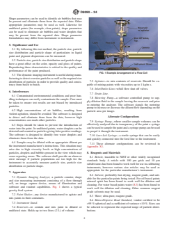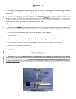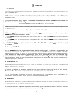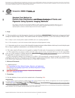 SIGNIFICANCE AND USE 5.1 By following this test method, the particle size, particle size distribution and particle shape of particulates in liquid paint and pigment dispersions can be measured. 5.2 Particle size, particle size distribution and particle shape have a great effect on the color, opacity and gloss of paints. Reproducing these characteristics is critical to the quality and performance of the paint produced. 5.3 The dynamic imaging instrument is useful during manufacturing to detect oversize particles as well as the required size distribution of particles in order to provide quality and consistency from batch to batch. SCOPE 1.1 This test method covers the determination of particle size distribution of liquid paints and pigmented liquid coatings by Dynamic Image Analysis. This method includes the reporting of particles ≥1 µm in size and up to 300 µm in size. Note 1: Shape is used to classify particles, droplets and bubbles and is not a reporting requirement. Note 2: The term paint(s) as used in this document includes liquid paint and liquid pigmented coatings. 1.1.1 Some paints may be too viscous to flow through the imaging instrument without dilution which may be used to help the paint flow as long as significant contamination is not introduced into the paint. 1.2 The values stated in SI units are to be regarded as standard. No other units of measurement are included in this standard. 1.3 This standard does not purport to address all of the safety concerns, if any, associated with its use. It is the responsibility of the user of this standard to establish appropriate safety, health, and environmental practices and determine the applicability of regulatory limitations prior to use. 1.4 This international standard was developed in accordance with internationally recognized principles on standardization established in the Decision on Principles for the Development of International Standards, Guides and Recommendations issued by the World Trade Organization Technical Barriers to Trade (TBT) Committee.