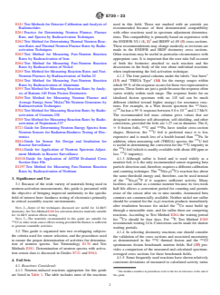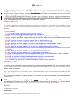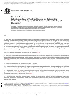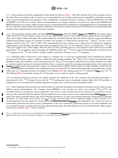 SIGNIFICANCE AND USE 3.1 Because of the wide variety of materials being used in neutron-activation measurements, this guide is presented with the objective of bringing improved uniformity to the specific field of interest here: hardness testing of electronics primarily in critical assembly reactor environments. Note 2: Some of the techniques discussed are useful for 14-MeV dosimetry. See Test Method E496 for activation detector materials suitable for 14-MeV neutron effects testing. Note 3: The materials recommended in this guide are suitable for 252Cf or other weak source effects testing provided the fluence is sufficient to generate countable activities. 3.2 This guide is organized into two overlapping subjects: the criteria used for sensor selection, and the procedures used to ensure the proper determination of activities for determination of neutron spectra. See Terminology E170 and Test Methods E181. Determination of neutron spectra with activation sensor data is discussed in Guides E721 and E944. SCOPE 1.1 This guide covers the selection and use of neutron-activation detector materials to be employed in neutron spectra adjustment techniques used for radiation-hardness testing of electronic semiconductor devices. Sensors are described that have been used at many radiation hardness-testing facilities, and comments are offered in table footnotes concerning the appropriateness of each reaction as judged by its cross-section accuracy, ease of use as a sensor, and by past successful application. This guide also discusses the fluence-uniformity, neutron self-shielding, and fluence-depression corrections that need to be considered in choosing the sensor thickness, the sensor covers, and the sensor locations. These considerations are relevant for the determination of neutron spectra from assemblies such as TRIGA- and Godiva-type reactors and from Californium irradiators. This guide may also be applicable to other broad energy distribution sources up to 20 MeV. Note 1: For definitions on terminology used in this guide, see Terminology E170. 1.2 This guide also covers the measurement of the gamma-ray or beta-ray emission rates from the activation foils and other sensors as well as the calculation of the absolute specific activities of these foils. The principal measurement technique is high-resolution gamma-ray spectrometry. The activities are used in the determination of the energy-fluence spectrum of the neutron source. See Guide E721. 1.3 Details of measurement and analysis are covered as follows: 1.3.1 Corrections involved in measuring the sensor activities include those for finite sensor size and thickness in the calibration of the gamma-ray detector, for pulse-height analyzer deadtime and pulse-pileup losses, and for background radioactivity. 1.3.2 The primary method for detector calibration that uses secondary standard gamma-ray emitting sources is considered in this guide and in Test Methods E181. In addition, an alternative method in which the sensors are activated in the known spectrum of a benchmark neutron field is discussed in Guide E1018. 1.3.3 A data analysis method is presented which accounts for the following: detector efficiency; background subtraction; irradiation, waiting, and counting times; fission yields and gamma-ray branching ratios; and self-absorption of gamma rays and neutrons in the sensors. 1.4 The values stated in SI units are to be regarded as standard. No other units of measurement are included in this standard. 1.5 This standard does not purport to address all of the safety concerns, if any, associated with its use. It is the responsibility of the user of this standard to establish appropriate safety, health, and environmental practices and determine the applicability of regulatory limitations prior to use. 1.6 This international standard was developed in accordance with internationally recognized principles on standardization established in the Decis...