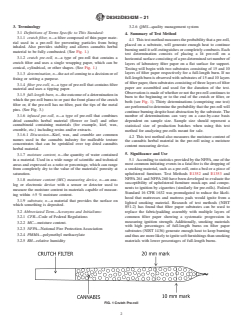 ASTM D8342/D8342M-21 is a standard published by ASTM International. Its full title is "Standard Test Method for Measuring the Probability of a Full Length Burn on a Cannabis/Hemp Pre-roll". This standard covers: SIGNIFICANCE AND USE 5.1 According to statistics provided by the NFPA, one of the most common initiating events in a fatal fire is the dropping of a smoking material, such as a pre-roll, onto a bed or a piece of upholstered furniture. Test Methods E1352 and E1353 and NFPA 261 and NFPA 260 have been developed to evaluate the susceptibility of upholstered furniture mock-ups and components to ignition by cigarettes (similarly for pre-rolls). Federal Standard 16 CFR 1632 was promulgated to reduce the likelihood that mattresses and mattress pads would ignite from a lighted smoking material. Research of test methods (NIST 851-2) has found that filter paper substrates can be used to replace the fabric/padding assembly with multiple layers of common filter paper showing a systematic progression in measuring ignition strength. Additionally, smoking materials with high percentages of full-length burns on filter paper substrates (NIST 1436) generate enough heat to keep burning and thus are more likely to ignite soft furnishings than smoking materials with lower percentages of full-length burns. 5.2 In this test method, the pre-rolls are subjected to a set of laboratory conditions. If different conditions are substituted or the end-use conditions are changed, it may not be possible to use this test method to predict quantitative changes in the fire test response. Therefore, the quantitative results are valid only for the fire test exposure conditions described in this test method. Pre-roll preparation and sampling are very important to ensure minimal impact on results. Preparation shall be made using Practice D8343/D8343M. 5.3 This test method outlines the moisture content of cannabis herbal material in the pre-roll. Determining the moisture content of cannabis herbal material used will shed more light on the effects of moisture on the probability of a pre-roll to achieve a full-length burn when ignited. 5.4 The data from this test method can help extrapolate whether a sample set of pre-ro... SCOPE 1.1 This fire-test-response standard provides a standard measure of the probability of a cannabis/hemp pre-roll positioned on a substrate to generate enough heat to continue burning and thus potentially cause ignition of bedding or upholstered furniture. 1.2 This test method shall be applicable to pre-roll units that are intended for personal inhalation by means of combustion and contain dried herbal material from any type of a cannabis plant, that is, cannabis/hemp. For the sake of brevity, the term “cannabis” shall be used henceforth to refer to any type of cannabis plant (cannabis/hemp). 1.3 This test method shall be applicable to pre-rolls that burn along the length of a cannabis pre-roll column. 1.4 This test method shall not be applicable to infused pre-rolls, which are outside the scope of this standard. 1.5 Pre-roll preparation and sampling shall be made using Practice D8343/D8343M. 1.6 Units—The values stated in either SI units or United States Customary units (USC units) are to be regarded separately as standard. The values stated in each system may not be exact equivalents; therefore, each system shall be used independently of the other. Combining values from the two systems may result in non-conformance with the standard. Metric units will be stated as standard and USC units will be shown in brackets relative to the metric units. 1.7 This standard does not purport to address all of the safety concerns, if any, associated with its use. It is the responsibility of the user of this standard to establish appropriate safety, health, and environmental practices and determine the applicability of regulatory limitations prior to use. 1.8 This international standard was developed in accordance with internationally recognized principles on standardization established in the Decision on Principles for the Development of International Standards, Guides and Recommendations issued by the World Trade Or...