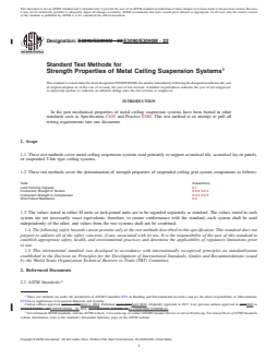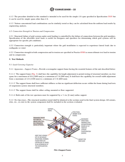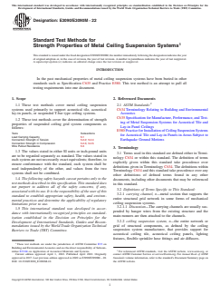 SIGNIFICANCE AND USE 4.1 Load Carrying Capacity: 4.1.1 Most architectural specifications contain a uniform load requirement based on Specification C635. Additionally, it is useful to know the uniform loads of cross runners to evaluate their suitability for various ceiling loads. 4.1.2 The procedure detailed in this standard is intended to be used for the simple 4 ft span specified in Specification C635 but it can be used for simple spans other than 4 ft. 4.1.3 Various concentrated load combinations can be similarly tested or they can be calculated from the uniform load results by engineering analysis. 4.2 Connection Strength in Tension and Compression: 4.2.1 Structural failure of grid systems under axial loading is controlled by the failure of connections between the grid members. Specification of the allowable axial loads is useful for designers and specifiers for determining which grid systems will be appropriate for specific job conditions. 4.2.2 Connection strength is particularly important where the grid installation is expected to experience lateral loads due to earthquake or wind. 4.2.3 Connection strength in both compression and in tension are specified in Practice E580 as mean ultimate test load in tension and in compression. SCOPE 1.1 These test methods cover metal ceiling suspension systems used primarily to support acoustical tile, acoustical lay-in panels, or suspended T-bar type ceiling systems. 1.2 These test methods cover the determination of strength properties of suspended ceiling grid system components as follows: Tests Subsections Load Carrying Capacity 5.1 Connection Strength in Tension 5.2.2; 5.2.4 Connection Strength in Compression 5.2.3; 5.2.5 Wire Pullout Resistance 5.3 1.3 The values stated in either SI units or inch-pound units are to be regarded separately as standard. The values stated in each system are not necessarily exact equivalents; therefore, to ensure conformance with the standard, each system shall be used independently of the other, and values from the two systems shall not be combined. 1.4 The following safety hazards caveat pertains only to the test methods described in this specification. This standard does not purport to address all of the safety concerns, if any, associated with its use. It is the responsibility of the user of this standard to establish appropriate safety, health, and environmental practices and determine the applicability of regulatory limitations prior to use. 1.5 This international standard was developed in accordance with internationally recognized principles on standardization established in the Decision on Principles for the Development of International Standards, Guides and Recommendations issued by the World Trade Organization Technical Barriers to Trade (TBT) Committee.