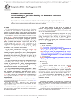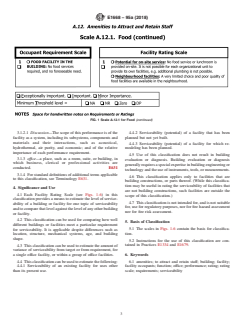 SIGNIFICANCE AND USE 4.1 Each Facility Rating Scale (see Figs. 1-6) in this classification provides a means to estimate the level of serviceability of a building or facility for one topic of serviceability and to compare that level against the level of any other building or facility. 4.2 This classification can be used for comparing how well different buildings or facilities meet a particular requirement for serviceability. It is applicable despite differences such as location, structure, mechanical systems, age, and building shape. 4.3 This classification can be used to estimate the amount of variance of serviceability from target or from requirement, for a single office facility, or within a group of office facilities. 4.4 This classification can be used to estimate the following: 4.4.1 Serviceability of an existing facility for uses other than its present use. 4.4.2 Serviceability (potential) of a facility that has been planned but not yet built. 4.4.3 Serviceability (potential) of a facility for which remodeling has been planned. 4.5 Use of this classification does not result in building evaluation or diagnosis. Building evaluation or diagnosis generally requires a special expertise in building engineering or technology and the use of instruments, tools, or measurements. 4.6 This classification applies only to facilities that are building constructions, or parts thereof. (While this classification may be useful in rating the serviceability of facilities that are not building constructions, such facilities are outside the scope of this classification.) 4.7 This classification is not intended for, and is not suitable for, use for regulatory purposes, nor for fire hazard assessment nor for fire risk assessment. SCOPE 1.1 This classification covers pairs of scales for classifying an aspect of the serviceability of an office facility, that is, the capability of an office facility to meet certain possible requirements in support of recruiting and keeping quality employees. 1.2 Within that aspect of serviceability, each pair of scales, shown in Figs. 1-6, are for classifying one topic of serviceability. Each paragraph in an Occupant Requirement Scale (see Figs. 1-6) summarizes one level of serviceability on that topic, which occupants might require. The matching entry in the Facility Rating Scale (see Figs. 1-6) is a translation of the requirement into a description of certain features of a facility which, taken in combination, indicate that the facility is likely to meet that level of required serviceability. FIG. 1 Scale A.12.1 for Food FIG. 1 Scale A.12.1 for Food (continued) FIG. 2 Scale A.12.2 for Shops FIG. 3 Scale A.12.3 for Daycare FIG. 4 Scale A.12.4 for Exercise Room FIG. 5 Scale A.12.5 for Bicycle Racks for Staff FIG. 6 Scale A.12.6 for Seating Away from Work Areas FIG. 6 Scale A.12.6 for Seating Away from Work Areas (continued) 1.3 The entries in the Facility Rating Scale (see Figs. 1-6) are indicative and not comprehensive. They are for quick scanning to estimate approximately, quickly, and economically, how well an office facility is likely to meet the needs of one or another type of occupant group over time. The entries are not for measuring, knowing, or evaluating how an office facility is performing. 1.4 This classification can be used to estimate the level of serviceability of an existing facility. It can also be used to estimate the serviceability of a facility that has been planned but not yet built, such as one for which single-line drawings and outline specifications have been prepared. 1.5 This classification indicates what would cause a facility to be rated at a certain level of serviceability but does not state how to conduct a serviceability rating nor how to assign a serviceability score. That information is found in Practice E1334. The scales in this classification are complimentary to and compatible with Practice E1334. Each...