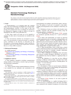 ASTM E2456-06(2020) is a standard published by ASTM International. Its full title is "Standard Terminology Relating to Nanotechnology". This standard covers: SIGNIFICANCE AND USE 3.1 This standard is intended to facilitate communication among members of the business, research, legal, government, and educational communities. 3.2 Definitions: 3.2.1 Terms and their related standard definitions in Section 4 are intended for use uniformly and consistently in all nanotechnology test methods, specifications, guides, and practices. The purpose of such use is to promote a clear understanding and interpretation of the standards in which they are used. 3.2.2 Definitions of terms are written in the broadest sense possible, consistent with the intended meaning using the following guidance considerations. 3.2.2.1 Terminology E1992 and Practice E1964 concepts are considered, especially Sections 6.5, 7, and 8 of Practice E1964. 3.2.2.2 Terms and nomenclature are based on observed scientific phenomena and are descriptive, distinguishable, and have significant currency in the nanotechnology field as reflected in peer-reviewed articles and other objective sources. These terms and names should not disrupt accepted usage in other scientific and technological fields, and their preferred usage should follow accepted scientific syntax. 3.2.2.3 When incorporating a term or name from a related field, its underlying meaning is not redefined. Modifications are minimal and are done to elucidate scientific distinctions required by nanotechnology practitioners. 3.2.2.4 When conflicting or overlapping terms and names arise between scientific disciplines, precedence was given to the established term that has behind it a significant body of knowledge. 3.2.2.5 The definition of a term that can have different meanings in different technical fields, especially those fields beyond nanotechnology, is preceded by a limiting phrase, for example, “in nanotechnology.” 3.3 Description of Terms: 3.3.1 Descriptions of Terms are special purpose definitions intended to provide a precise understanding and interpretation of standards in which they are used. 3.3... SCOPE 1.1 Nanotechnology is an emerging field; this standard defines the novel terminology developed for its broad multi- and interdisciplinary activities. As the needs of this area develop, this standard will evolve accordingly. Its content may be referenced or adopted, or both, in whole or in part, as demanded by the needs of the individual user. 1.2 The values stated in SI units are to be regarded as standard. No other units of measurement are included in this standard. 1.3 This international standard was developed in accordance with internationally recognized principles on standardization established in the Decision on Principles for the Development of International Standards, Guides and Recommendations issued by the World Trade Organization Technical Barriers to Trade (TBT) Committee.