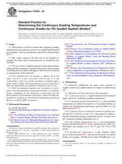ASTM D7643-22: Standard Practice for Determining the Continuous Grading Temperatures and Continuous Grades for PG Graded Asphalt Binders establishes a method for estimating continuous grading temperatures and corresponding grades for performance-graded (PG) asphalt binders. This ASTM standard is primarily intended for use in research, forensic analysis, production, blending, modification, and evaluation of asphalt binders. It supports informed decision-making in the context of Specification D6373 but explicitly prohibits use for the sale or purchase of asphalt binders.