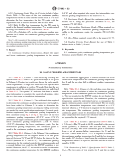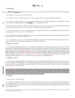 SIGNIFICANCE AND USE 5.1 The continuous grading temperatures and continuous grade are used for informational purposes only and shall not be used for the sale or purchase of asphalt binders. The continuous grading temperatures and continuous grade may be used for forensic or research studies and when producing, blending, modifying, or otherwise evaluating asphalt binders. This guide is applicable to Specification D6373, Tables 1 and 2. Note 1: The quality of the results produced by this standard are dependent on the competence of the personnel performing the procedure and the capability, calibration, and maintenance of the equipment used. Agencies that meet the criteria of Specification D3666 are generally considered capable of competent and objective testing, sampling, inspection, etc. Users of this standard are cautioned that compliance with Specification D3666 alone does not completely ensure reliable results. Reliable results depend on many factors; following the suggestions of Specification D3666 or some similar acceptable guideline provides a means of evaluating and controlling some of those factors. SCOPE 1.1 This practice is used to estimate the continuous grading temperatures and continuous grade for an asphalt binder graded in accordance with the requirements specified in Specification D6373. 1.2 The values stated in SI units are to be regarded as standard. No other units of measurement are included in this standard. 1.3 The text of this standard references notes and footnotes which provide explanatory material. These notes and footnotes (excluding those in tables and figures) shall not be considered as requirements of the standard. 1.4 This standard does not purport to address all of the safety concerns, if any, associated with its use. It is the responsibility of the user of this standard to establish appropriate safety, health, and environmental practices and determine the applicability of regulatory limitations prior to use. 1.5 This international standard was developed in accordance with internationally recognized principles on standardization established in the Decision on Principles for the Development of International Standards, Guides and Recommendations issued by the World Trade Organization Technical Barriers to Trade (TBT) Committee.