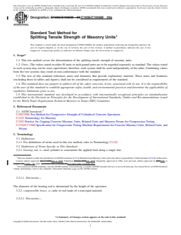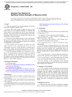 SIGNIFICANCE AND USE 5.1 Masonry units alone and within assemblages commonly fail in a tensile mode when loaded in compression to failure. These tensile stresses result from differences in modulus of elasticity and Poisson's ratio between the masonry unit and mortar. Additionally, the dissimilarity in behavior of the grout within cores of masonry units under load leads to tensile stresses in the units and results in a splitting failure. 5.2 This test method produces a line load along the bed surface of the masonry unit. The compressive load applied to the unit, imposed by means of bearing rods, results in a tensile stress distributed over the height of the unit for the split length of the unit. This test method can be conducted with the rod oriented either in the longitudinal direction or in the transverse direction of the bed face. The splitting tensile strength is calculated by the equation given in 10.1. 5.3 The test value provides an indicator of masonry-unit splitting tensile strength. Additionally, the presence of defects such as visible voids or impurities in masonry units may be revealed. 5.4 The moisture content of the specimen will affect test results. 5.5 The height of the specimen will affect test results. SCOPE 1.1 This test method covers the determination of the splitting tensile strength of masonry units. 1.2 Units—The values stated in either SI units or inch-pound units are to be regarded separately as standard. The values stated in each system may not be exact equivalents; therefore, each system shall be used independently of the other. Combining values from the two systems may result in non-conformance with the standard. 1.3 The text of this standard references notes and footnotes that provide explanatory material. These notes and footnotes (excluding those in tables and figures) shall not be considered as requirements of the standard. 1.4 This standard does not purport to address all of the safety concerns, if any, associated with its use. It is the responsibility of the user of this standard to establish appropriate safety, health, and environmental practices and determine the applicability of regulatory limitations prior to use. 1.5 This international standard was developed in accordance with internationally recognized principles on standardization established in the Decision on Principles for the Development of International Standards, Guides and Recommendations issued by the World Trade Organization Technical Barriers to Trade (TBT) Committee.