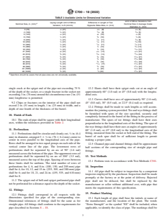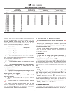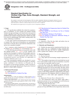 ASTM C700-18(2022) is a technical specification published by ASTM International. Its full title is "Standard Specification for Vitrified Clay Pipe, Extra Strength, Standard Strength, and Perforated". This standard covers: ABSTRACT This specification covers extra strength and standard strength vitrified clay pipe and fittings to be used for the conveyance of sewage, industrial wastes, and storm water; and extra strength perforated and standard strength perforated vitrified clay pipe to be used for underdrainage, filter fields, leaching fields, and similar subdrainage installations. Vitrified clay pipe shall be manufactured from fire clay, shale, surface clay, or a combination of these materials that, when formed into pipe and fired to suitable temperatures. Pipe shall meet the bearing strength requirements prescribed. The manufacturer shall at his option, apply either a hydrostatic pressure test or an absorption test to all of the test specimens in each size and run of the pipe. The absorption of vitrified clay pipe shall not exceed 8%. The acid resistance test is used to determine the resistance of pipe to the action of acids encountered in sanitary sewers. SCOPE 1.1 This specification establishes the criteria for acceptance, prior to installation, of extra strength and standard strength vitrified clay pipe and fittings to be used for the conveyance of sewage, industrial wastes, and storm water; and extra strength perforated and standard strength perforated vitrified clay pipe to be used for underdrainage, filter fields, leaching fields, and similar subdrainage installations. 1.2 The values stated in inch-pound units are to be regarded as standard. The values given in parentheses are mathematical conversions to SI units that are provided for information only and are not considered standard. Note 1: Attention is called to Specification C425, Test Method C828, Test Method C1091, Test Methods C301, and Terminology C896. 1.3 The following precautionary caveat pertains only to the Test Method portion, 5.2 – 5.2.3.2 of this standard: This standard does not purport to address all of the safety concerns, if any, associated with its use. It is the responsibility of the user of this standard to establish appropriate safety, health, and environmental practices and determine the applicability of regulatory limitations prior to use. 1.4 This international standard was developed in accordance with internationally recognized principles on standardization established in the Decision on Principles for the Development of International Standards, Guides and Recommendations issued by the World Trade Organization Technical Barriers to Trade (TBT) Committee.