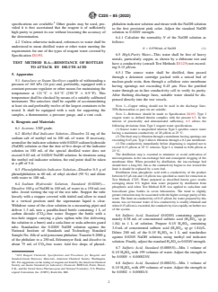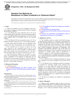 ASTM C225-85(2022) is a standard published by ASTM International. Its full title is "Standard Test Methods for Resistance of Glass Containers to Chemical Attack". This standard covers: SIGNIFICANCE AND USE 3.1 The solubility of glass in contact with food, beverages, or pharmaceutical products is an important consideration for the safe packaging and storage of such materials. Autoclave conditions are specified since sterilization is often employed for the packaging of the product. It also represents one of the most extreme conditions, particularly of temperature, that containers will ordinarily experience. Any of the three test methods described may be used to establish specifications for conformity to standard values, either as specified by a customer, an agency, or “The United States Pharmacopeia:” 3.1.1 Test Method B-A is intended particularly for testing glass containers primarily destined for containment of products with a pH under 5. 3.1.2 Test Method B-W is intended particularly for testing glass containers to be used for products with a pH of 5.0 or over. 3.1.3 Test Method P-W is a hydrolytic autoclave test primarily intended for evaluating samples from untreated glass containers. It is often useful for testing the resistance of containers of too small capacity to permit measurements of solubility on the unbroken article by the B-W test method. Yielding the water resistance of the bulk glass, it can also be used in conjunction with the B-W test method to distinguish whether the internal surface of a container has been treated to improve its durability. 3.2 All three test methods are suitable for specification acceptance. SCOPE 1.1 These test methods cover the evaluation of the resistance of glass containers to chemical attack. Three test methods are presented, as follows: 1.1.1 Test Method B-A covers autoclave tests at 121 °C on bottles partially filled with dilute acid as the attacking medium. 1.1.2 Test Method B-W covers autoclave tests at 121 °C on bottles partially filled with distilled water as the attacking medium. 1.1.3 Test Method P-W covers autoclave tests at 121 °C on powdered samples with pure water as the attacking medium. 1.2 The values stated in SI units are to be regarded as the standard. The values in parentheses are for information only. 1.3 This standard does not purport to address all of the safety concerns, if any, associated with its use. It is the responsibility of the user of this standard to establish appropriate safety, health, and environmental practices and determine the applicability of regulatory limitations prior to use. 1.4 This international standard was developed in accordance with internationally recognized principles on standardization established in the Decision on Principles for the Development of International Standards, Guides and Recommendations issued by the World Trade Organization Technical Barriers to Trade (TBT) Committee.