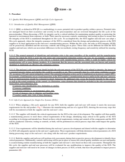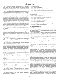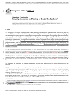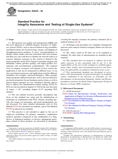 SIGNIFICANCE AND USE 4.1 This practice provides: 4.1.1 A holistic approach to evaluate risks associated with an integrity breach in a SUS, considering its life cycle from development to disposal. 4.1.2 An overview of physical and microbial test methods that could be applicable to SUS testing, for qualification and validation purposes, as well as for routine testing. 4.1.3 Information on the main challenges faced when testing SUSs for integrity. 4.2 This practice can be used by SUS suppliers and SUS end users to define an integrity assurance strategy for SUSs, with the relevant tests when appropriate. SCOPE 1.1 This practice uses quality risk management (QRM) and life-cycle approach to establish integrity assurance of single-use systems (SUSs), such as but not limited to bag assemblies and liquid transfer sets for processing, storage, and shipping of (bio)pharmaceutical products. It gives recommendations to identify failure modes and risks associated with such systems and their use-cases and how to identify the relevant leak(s) of concern. Integrity assurance in this context is limited to the barrier properties of the SUS, linked to microbial integrity and bioburden control (product quality) and liquid product loss (operator and environmental contamination). The required level of integrity assurance will depend on how critical the application is and can be interpreted in different ways. It can also vary between processes and applications used for different modalities (for example, advanced therapies). Other package barrier properties different from that, such as but not limited to gas barrier properties for gas headspace preservation, as well as porous barrier packages are not considered. Specific aspects how to address the contamination control strategy (CCS) for SUS are also described in chapters 8.131ff of the new Revision of Annex 1 (1),2 including chapter 8.137 regarding SUS integrity. 1.2 The test method overview provides descriptions that focus on the standard test setup and the identification of challenges in combination with SUSs. Details, including specific test setups, test parameter, and result interpretation, are not discussed. For more detailed information refer to Test Method E3251 for microbial test methods, and to Test Method E3336 for physical test methods. 1.3 This practice is not intended to apply to the use of single-use technology for primary containers, combination products (products composed of any combination of a drug, device, or biological product), or devices. Appropriate procedures related to these products are discussed in documents covering the integrity assurance for primary containers (2) or medical products (1, 3). 1.4 Techniques and procedures for complaint management and root cause analysis related to integrity failures are also not discussed. 1.5 The values stated in SI units are to be regarded as standard. No other units of measurement are included in this standard. 1.6 This standard does not purport to address all of the safety concerns, if any, associated with its use. It is the responsibility of the user of this standard to establish appropriate safety, health, and environmental practices and determine the applicability of regulatory limitations prior to use. 1.7 This international standard was developed in accordance with internationally recognized principles on standardization established in the Decision on Principles for the Development of International Standards, Guides and Recommendations issued by the World Trade Organization Technical Barriers to Trade (TBT) Committee.